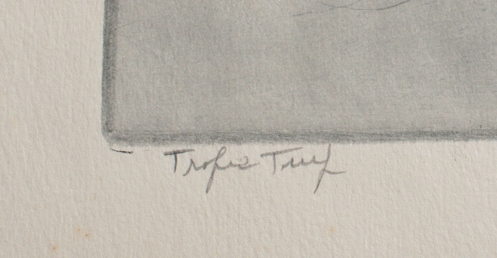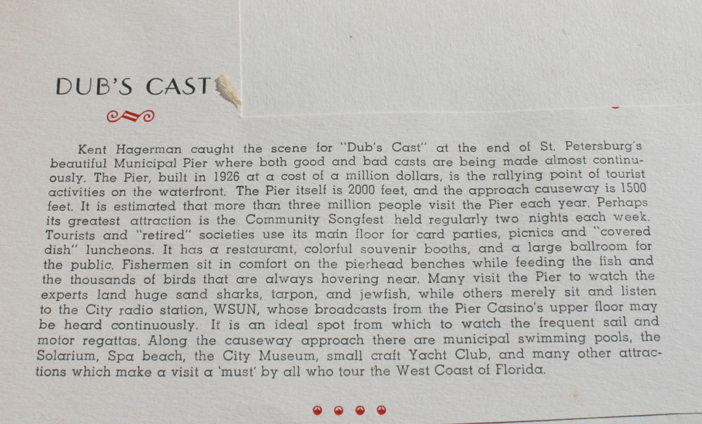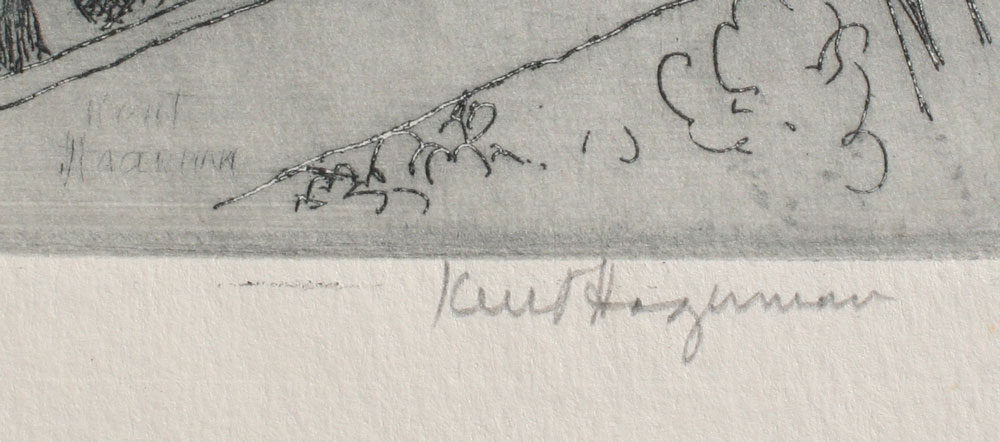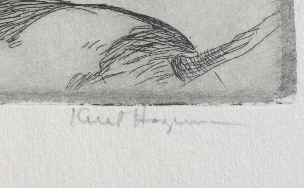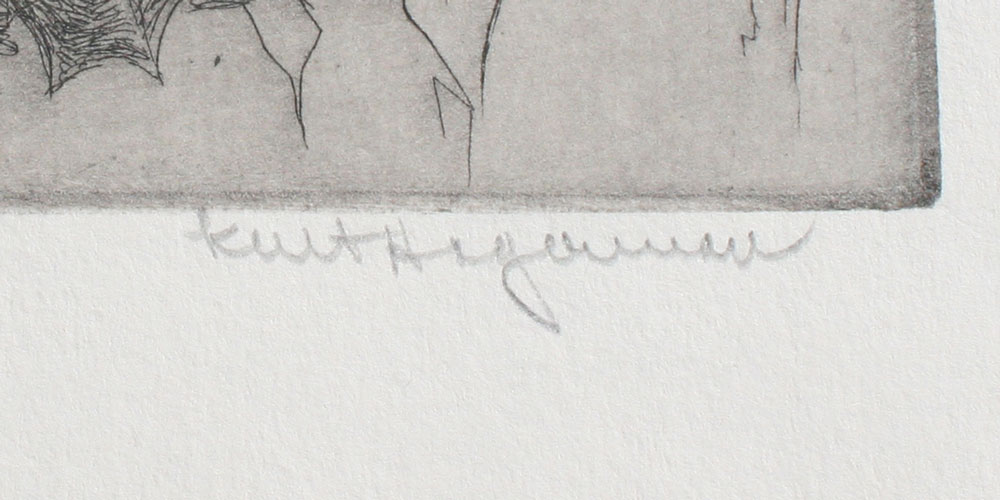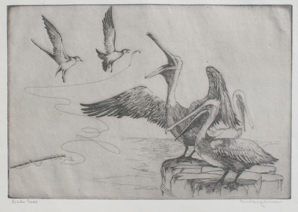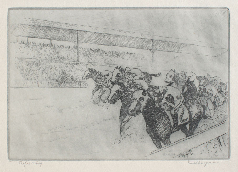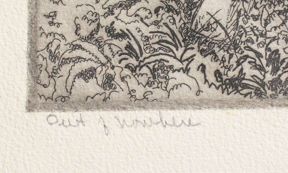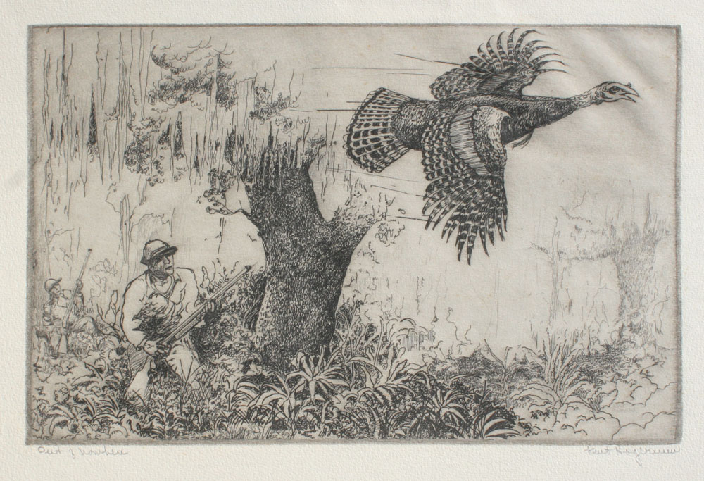 HAGERMAN, Kent, (American, 1893-1978): 6 Etchings, pencil signed and titled, each measuring 10'' x 13'', all unframed. ''Dub's Cast'', ''Out of Nowhere'', ''Tropic Turfs'', ''Florida Tusker'', ''Florida Bear Hunt'', ''Bowl Action'' which depicts a scene taken from the Annual Orange Bowl Classic. Each has individual artist's descriptions of the individual print.