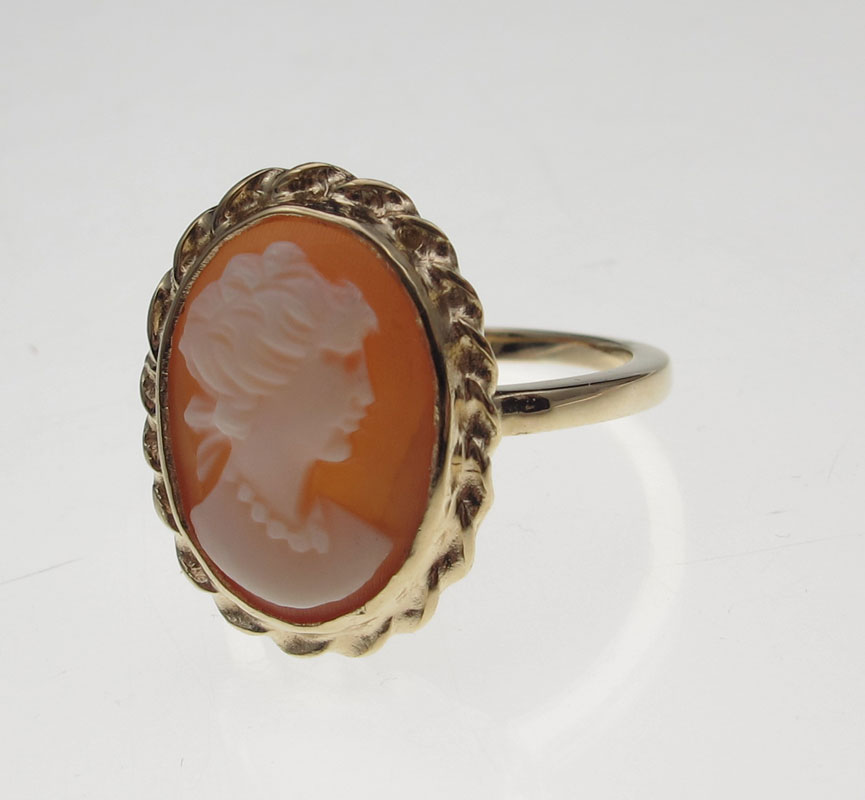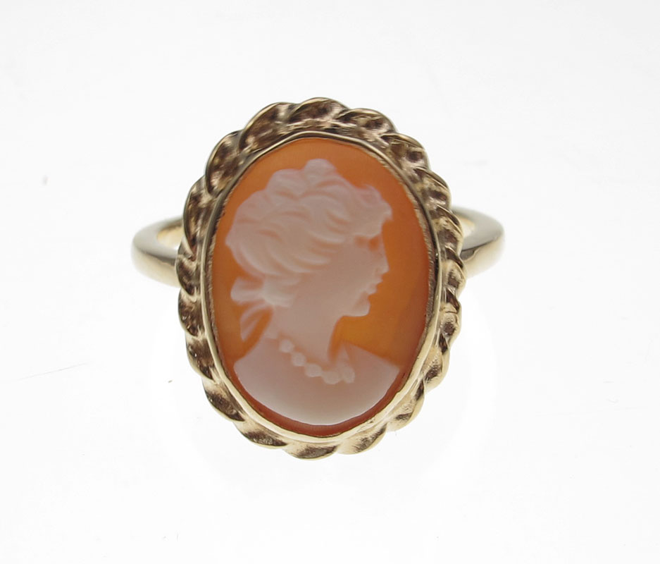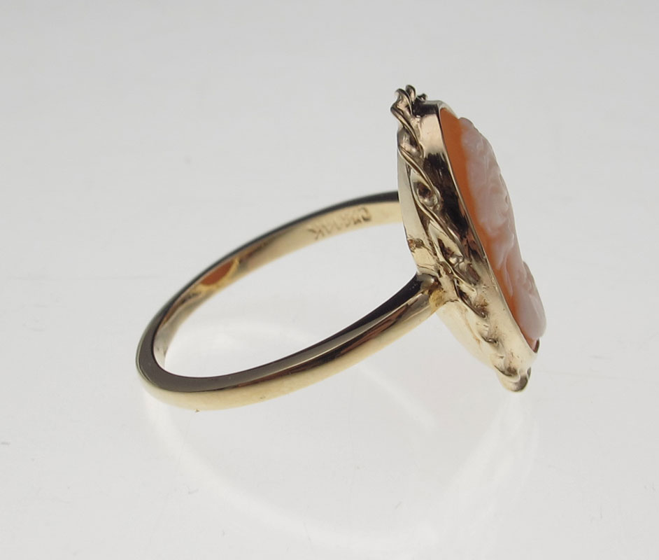 14K CAMEO RING: 14K yellow gold cameo ring. 16 x 12 mm oval shell cameo of female bust. Twisted bezel. Weight: 4.5 grams. Size: 9