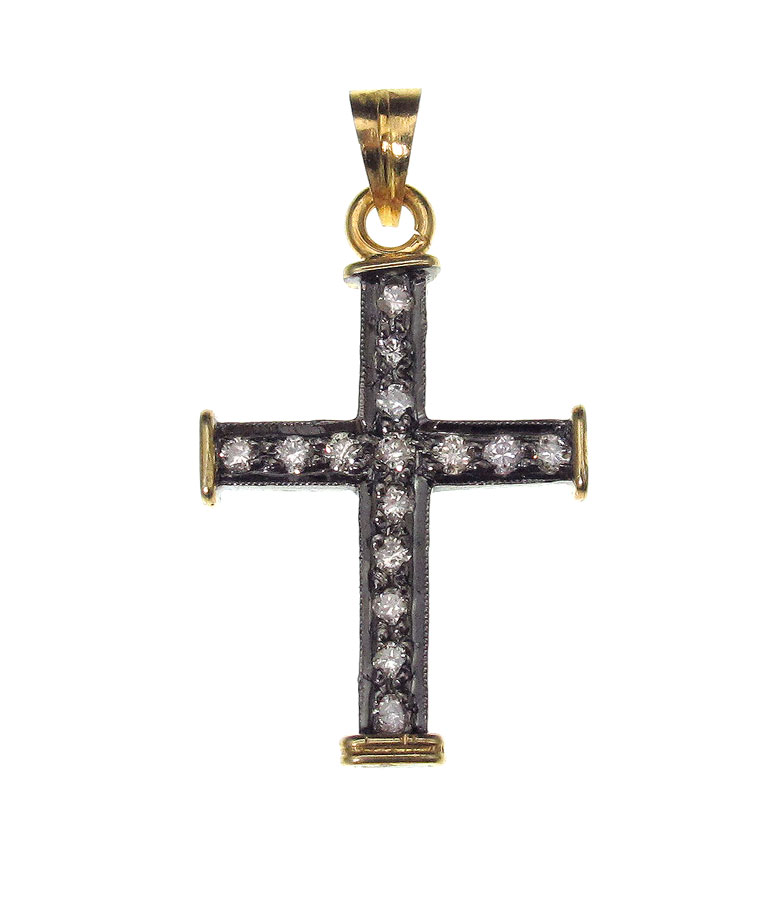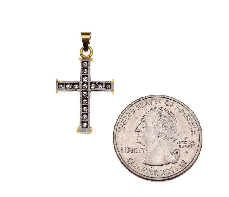 14K DIAMOND CROSS PENDANT: 14K cross pendant contains fifteen round full cut diamonds. Weight: .25 Ct. Approx. Rated VS-SI in clarity and Light Brown in color. The diamonds are bead set. Weight: 1.5 grams. 1 1/8''l.