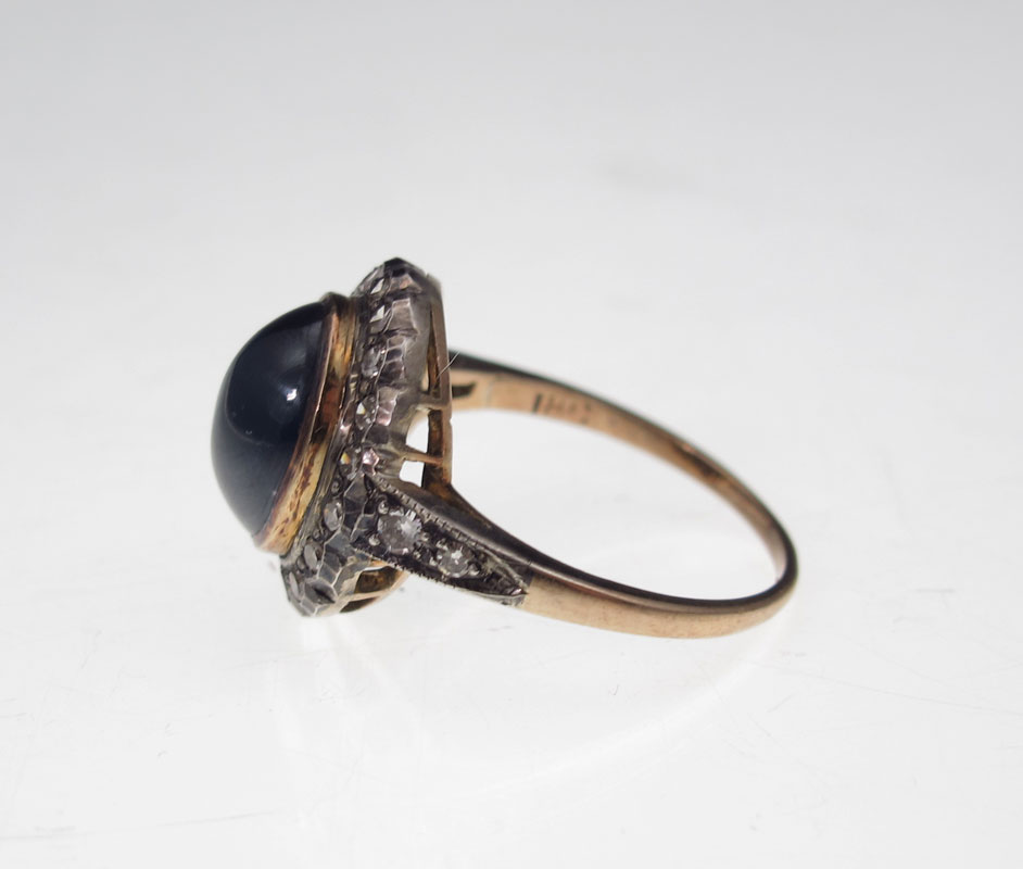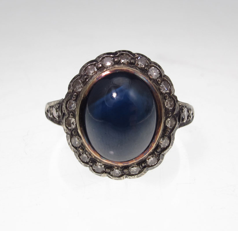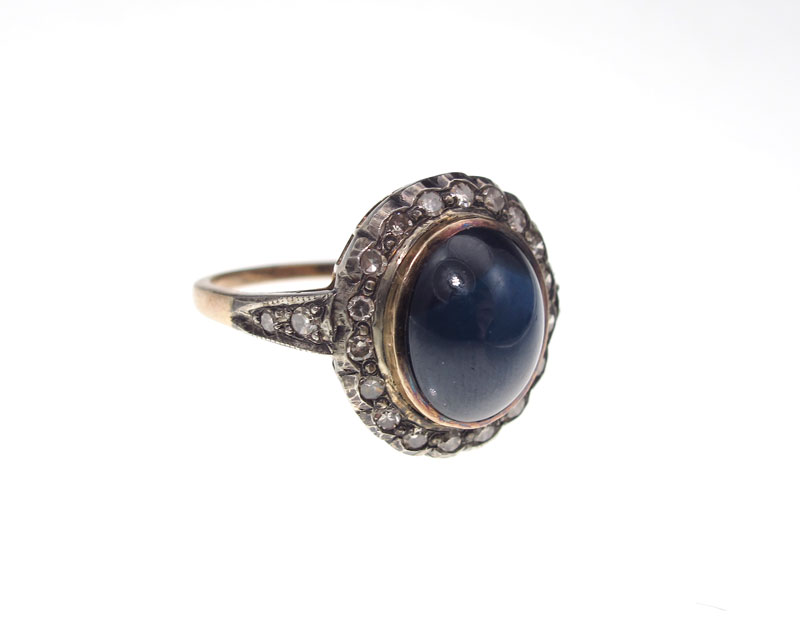 ANTIQUE STYLE SAPPHIRE RING: 18K yellow gold and sterling ring contains one oval cabochon cut sapphire. Weight: 6.25 Ct. Approx. Rated SI in clarity (Type II), B in Hue, 7 in Tone and 3 in Saturation. Twenty two round single cut diamonds. Weight: .33 Ct. Approx. Rated VS-SI in clarity and Light Brown in color. The sapphire is bezel set. The diamonds are bead set. Weight: 5.1 grams. Size:7.5
