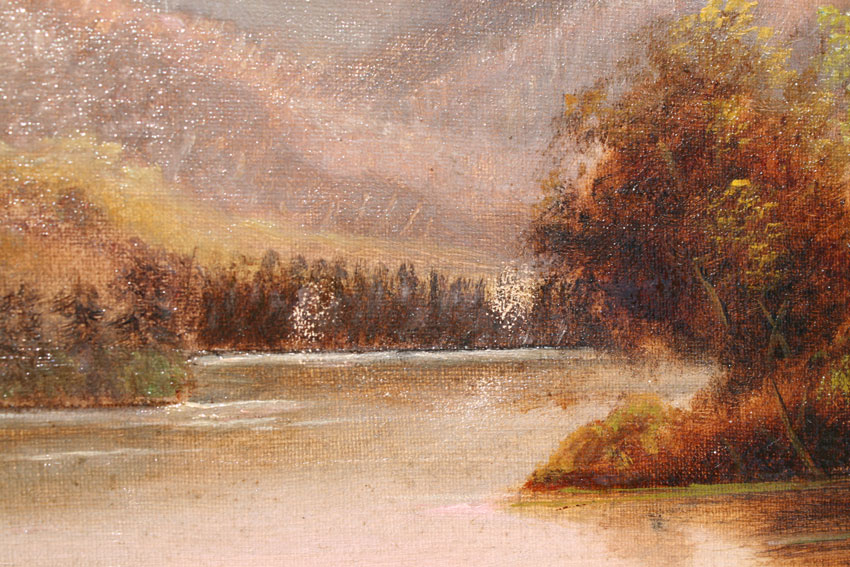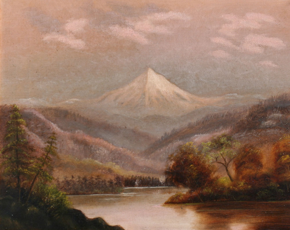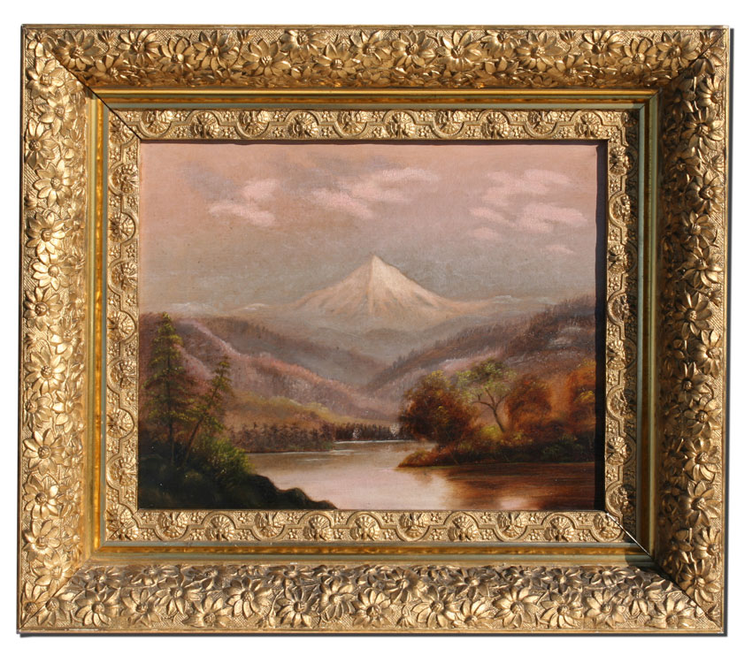 19TH CENTURY OIL ON CANVAS OF MOUNT HOOD IN THE STYLE OF ELIZA BARCHUS: 12'' x 15'', no visible signature, period foliate motif gilded gesso frame, 18'' x 21''.