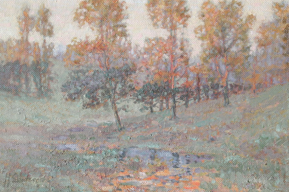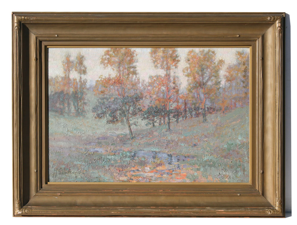 STOLTENBERG, Hans, (American, 1879-1963): Autumn Landscape, OIL/Board, 14 3/4'' x 22'', signed, period carved and gilded frame with wear, 21'' x 28''.