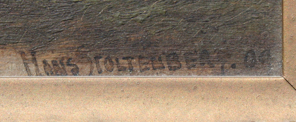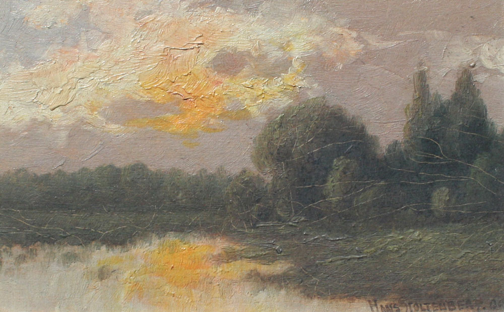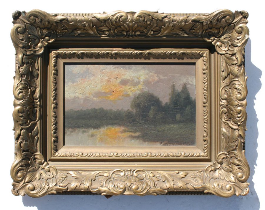 STOLTENBERG, Hans, (American, 1879-1963): Wisconsin Sunset on the Pond, OIL/Board, 6'' x 9'', signed lower right, dated '04, encased in period carved gilded gesso frame with wear, 12'' x 15''.