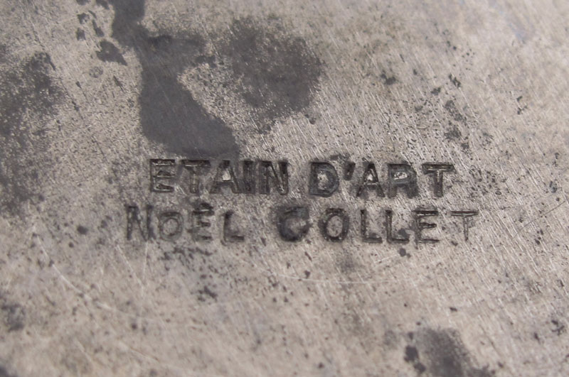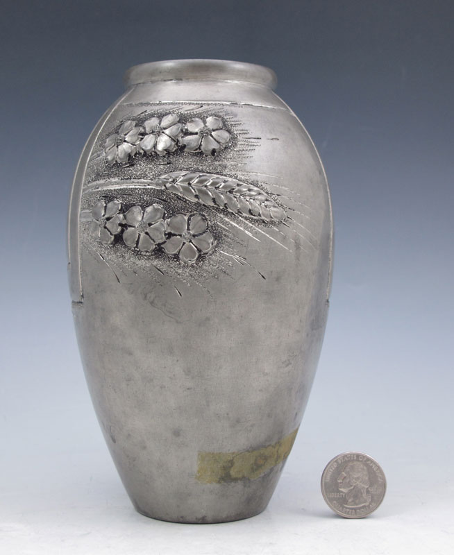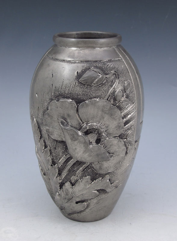 NOEL COLLET METAL ART NOUVEAU VASE: Poppies design, signed on side, impressed stamp Etain D' Art, Noel Collet on base. 6 1/2'' h. x 4''.