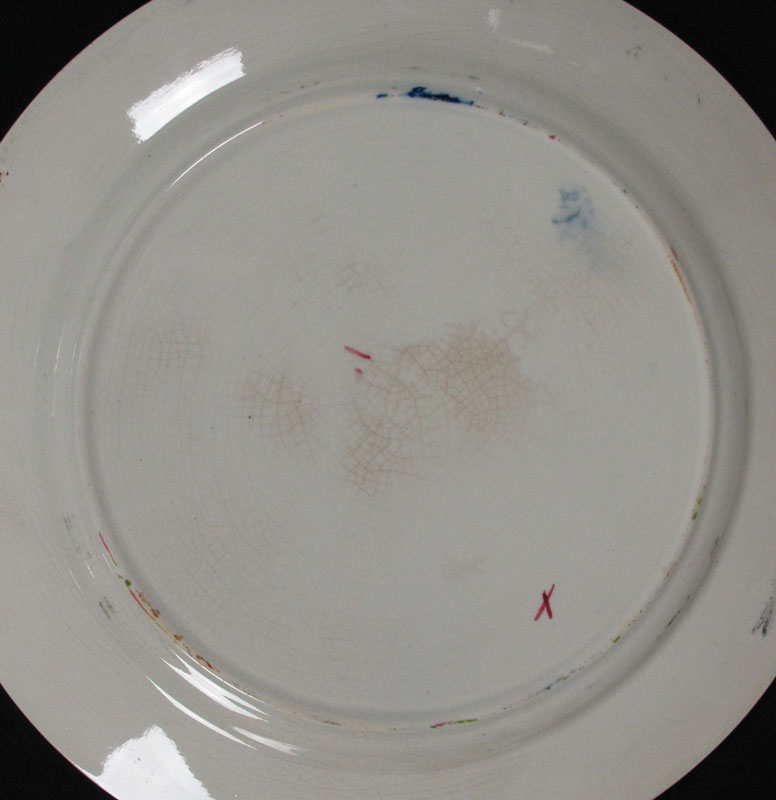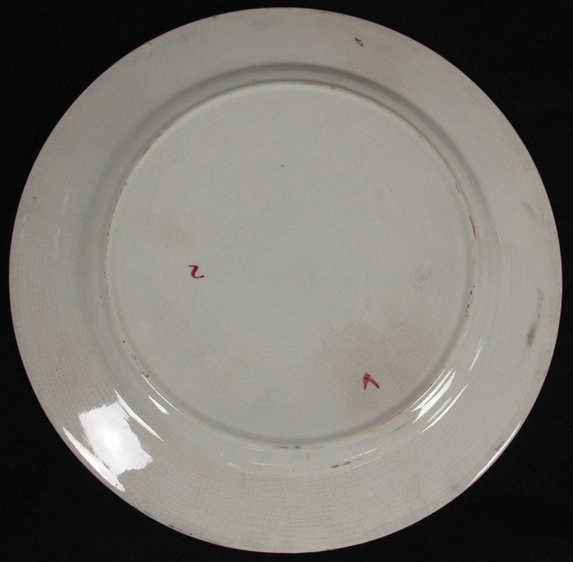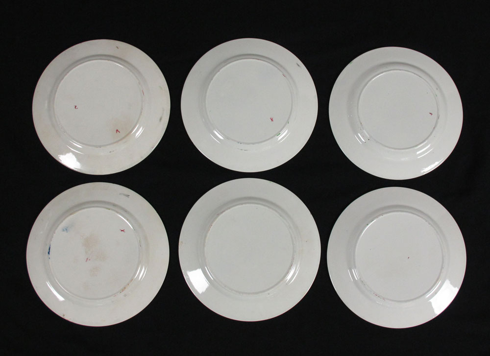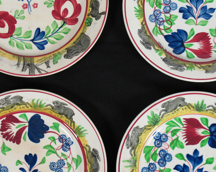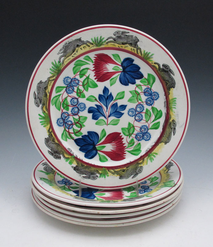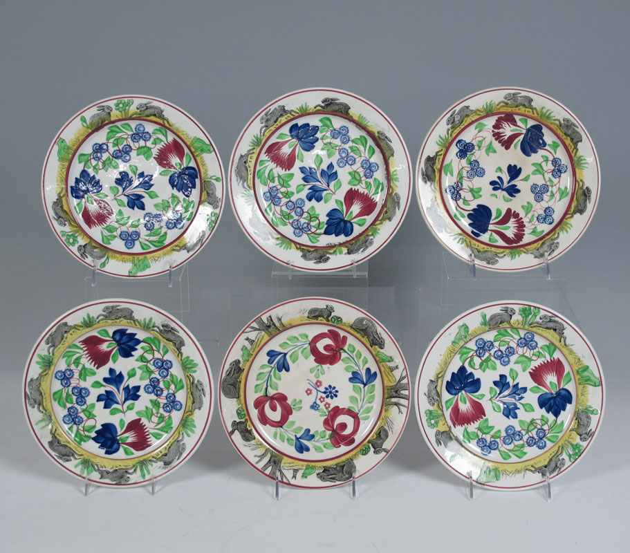 SET OF 6 EARLY 1900'S SPATTERWARE PLATES: Hand sponge, stick and spatterware floral and berry decoration framed in an outer band of rabbits, 9 1/2'' dia.