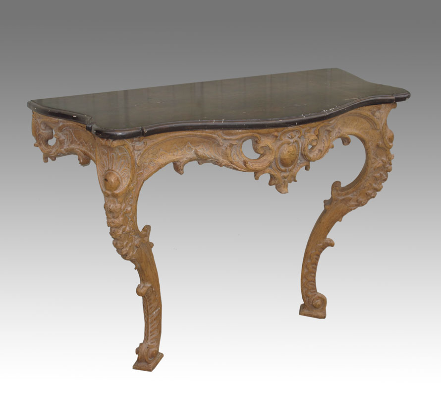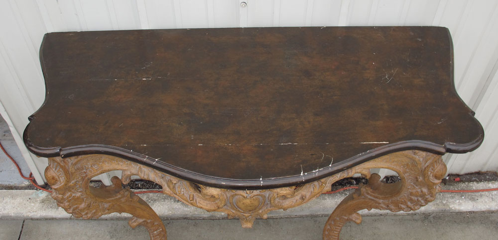 PIERCE CARVED ITALIAN DEMI HALL TABLE: Married piece with carved and shaped wooden top in a painted faux marble finish fitted onto a wall mount carved table. Approx.35'' tall x 50'' x 23 1/2''.