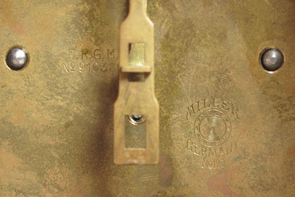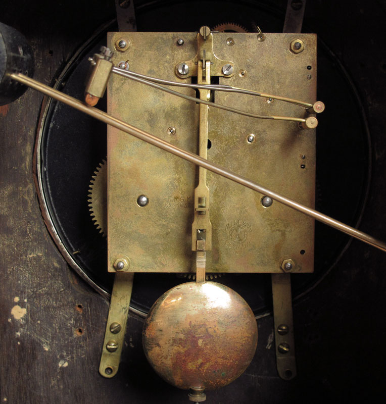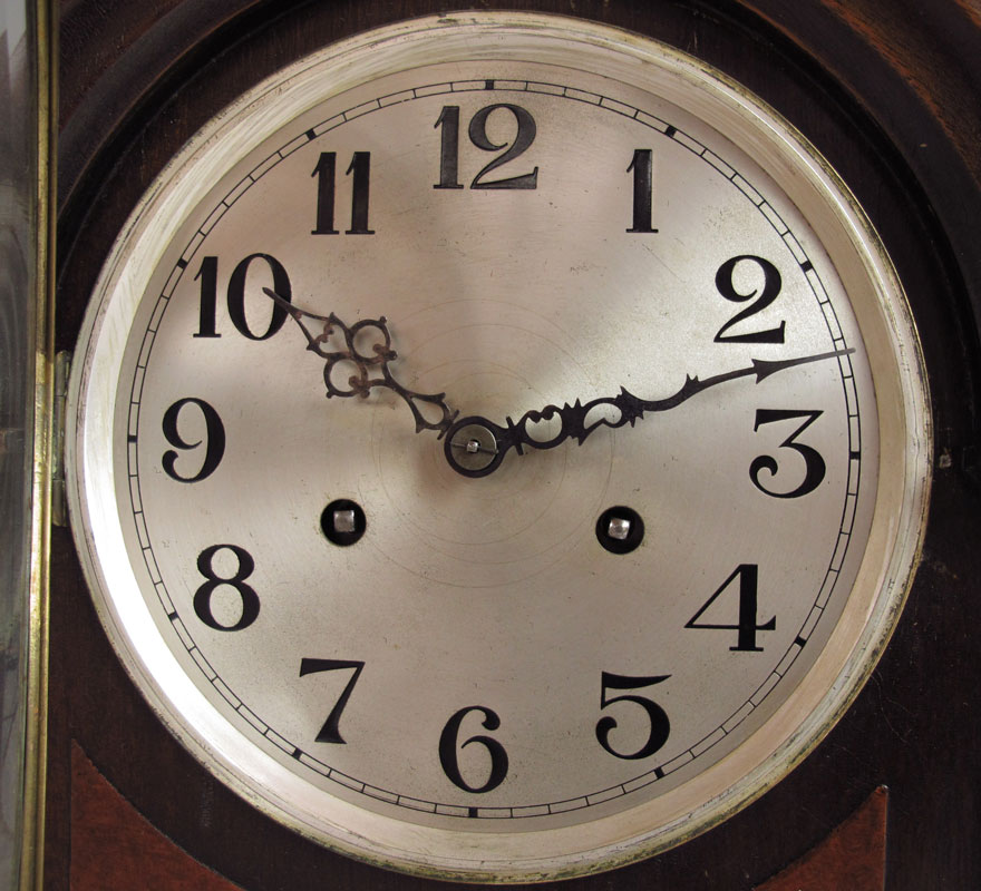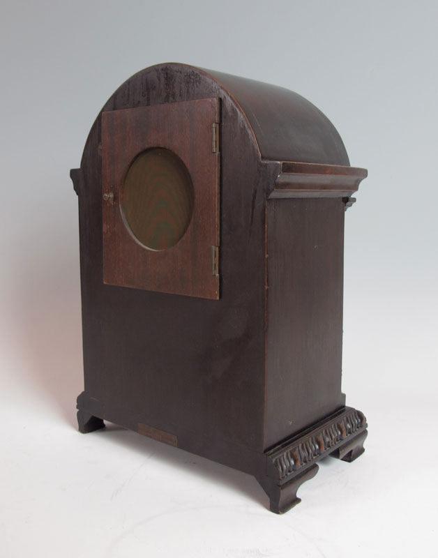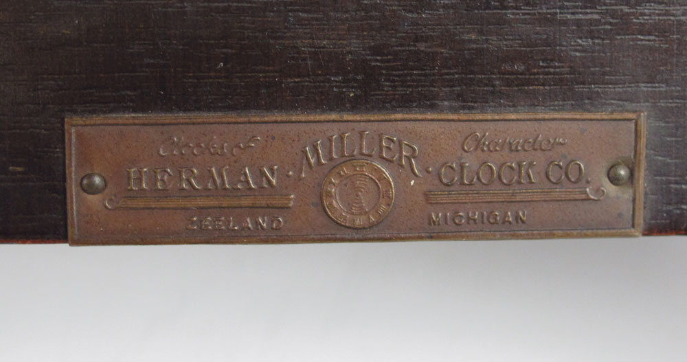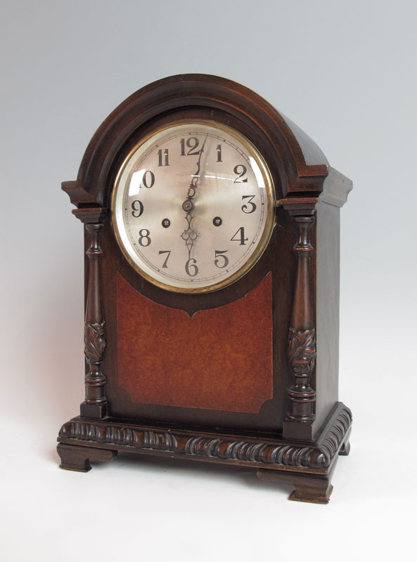 HERMAN MILLER MANTLE CLOCK: Domed wood case with carved half columns and applied burl veneer decoration. Silvered dial with Arabic numerals. Time and strike movement, key and pendulum in office. Marked Miller Germany No. 120 on movement, Herman Miller plaque on back. 16 1/4'' x 11 1/2'' x 7''.