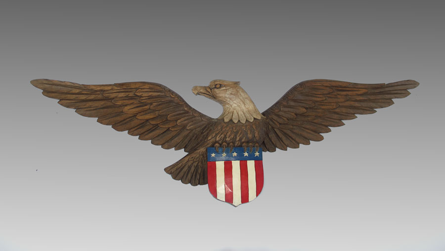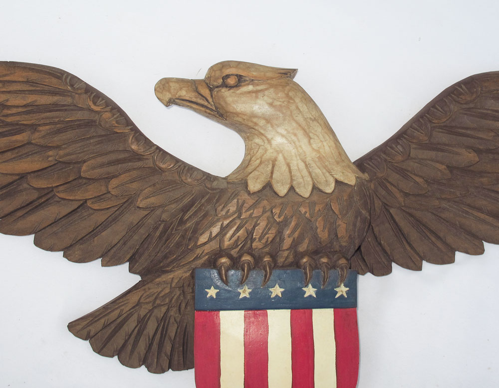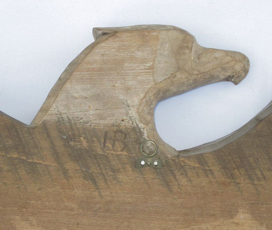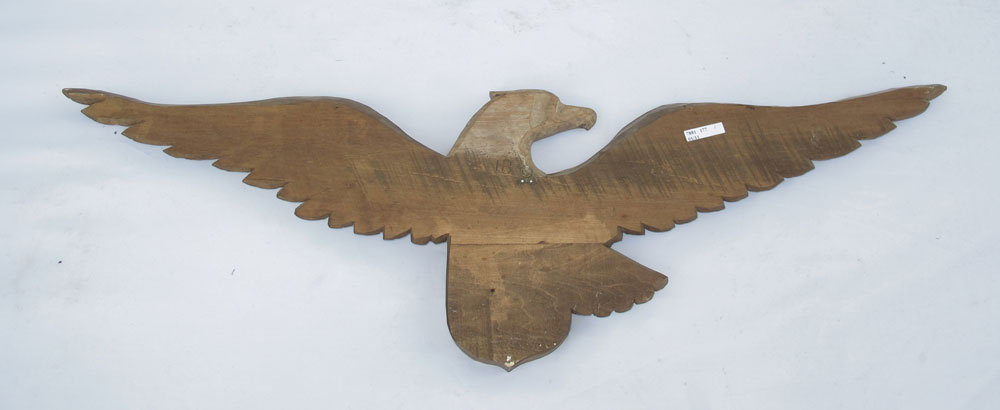 FOLK ART CARVED WOOD EAGLE SIGNED HB: Approx. 40''l. x 12'' x 2'' deep.