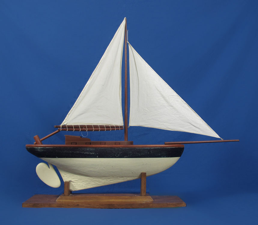 LARGE WOOD POND BOAT ON STAND: Mid 20th century hand crafted and painted pond boat with 2 canvas sails. Boat measures 32'' h. x 40'' x 6 1/2''. Sold with wood stand 6'' x 27 1/4'' x 8''.