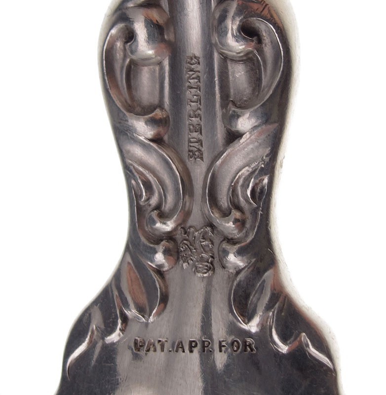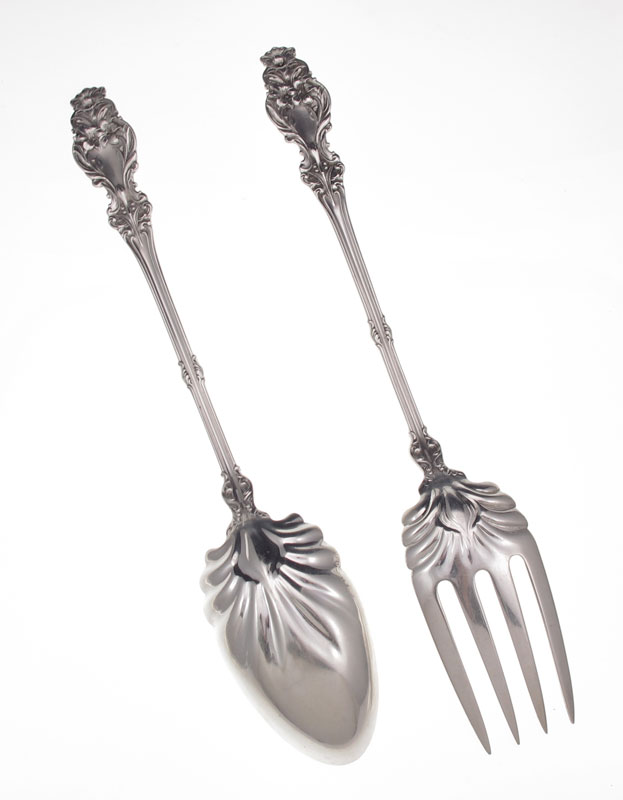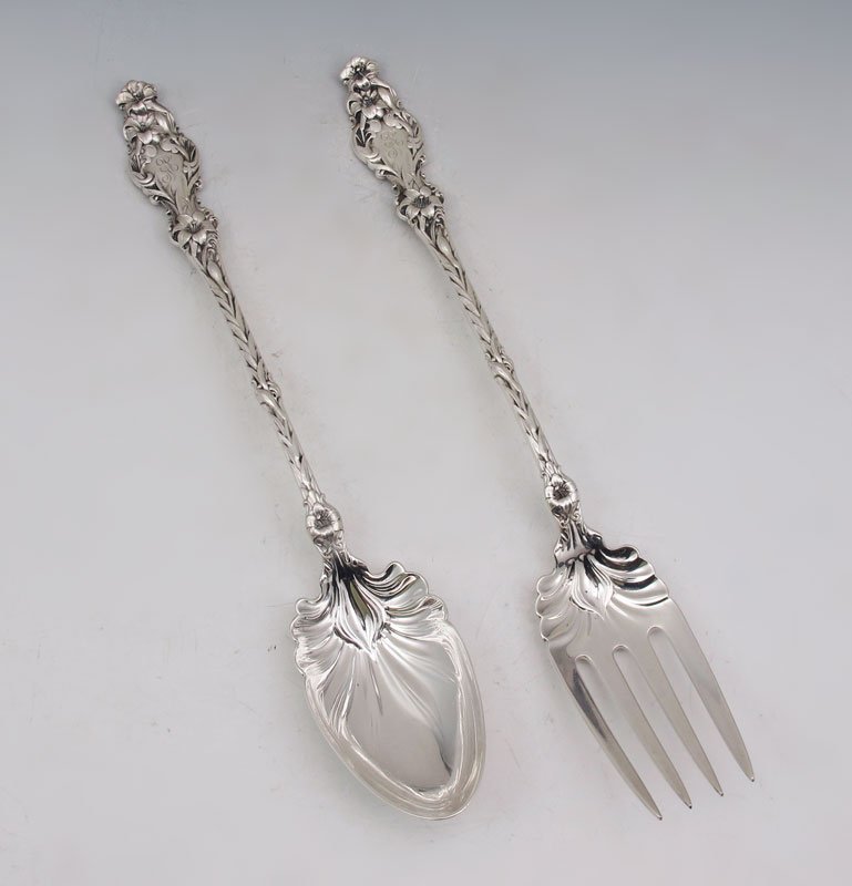 WHITING LILY STERLING SALAD SET: 2 piece set in the Lily pattern by Whiting to include fork 11 3/4'', spoon 11 1/2''. Monogrammed. Approx. 10.3 troy oz.