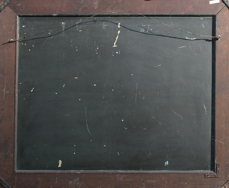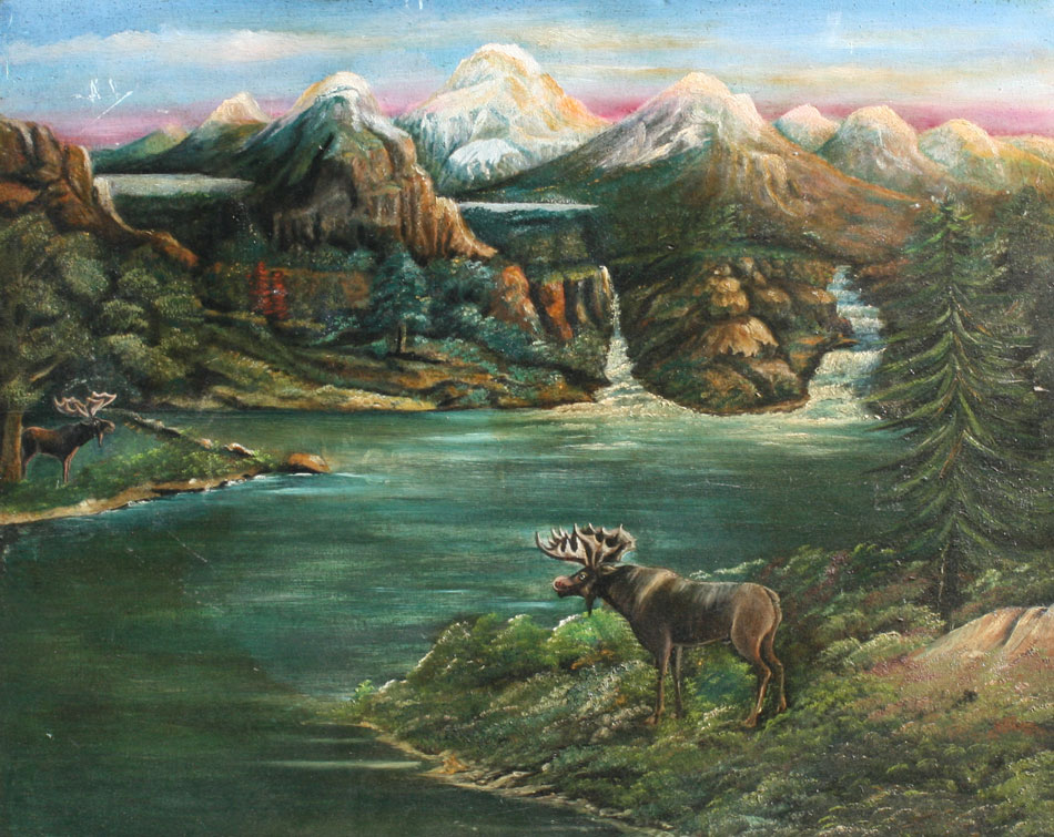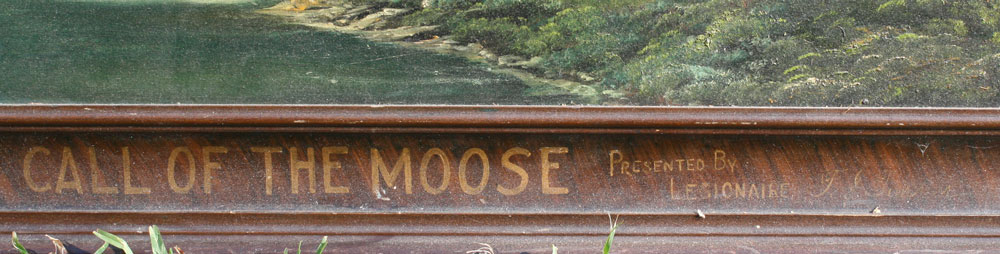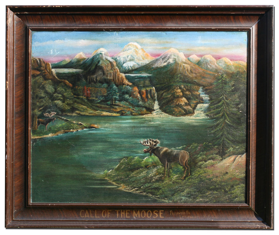 FOLK ART OIL ON BOARD TITLED ''CALL OF THE MOOSE'': 27'' x 34'', unsigned, title painted on the frame, faux grain painted wood frame with wear, 36'' x 42 1/2''.