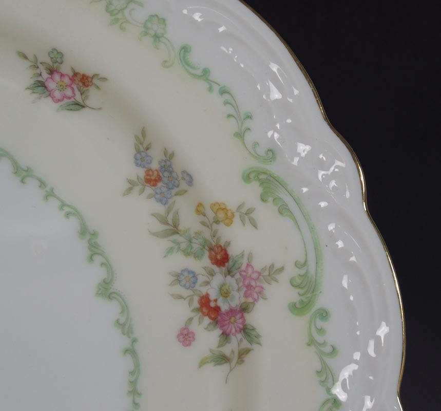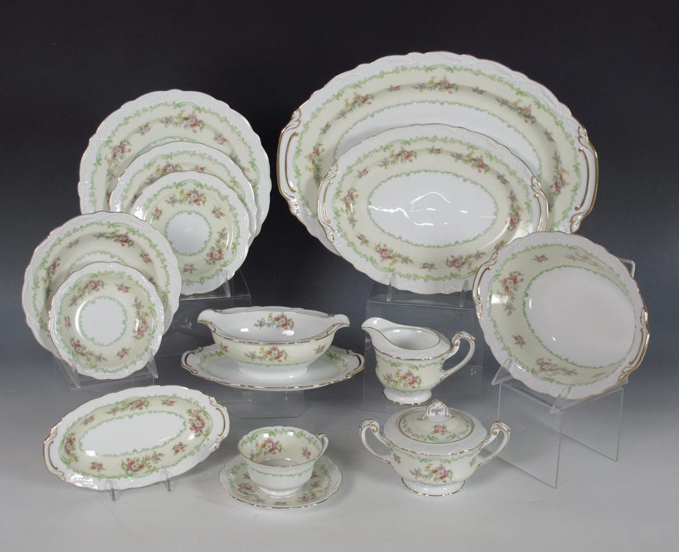 NORITAKE FINE CHINA SERVICE: Approx. 86 pieces to include 12 dinner plates, 12 salad plates, 12 bread plates (4 chips), 12 dessert bowls, 14 cups, 16 saucers, oval vegetable, uncovered round vegetable, relish tray, sugar, creamer, gravy boat, a 12'' platter, and the large 16'' platter.