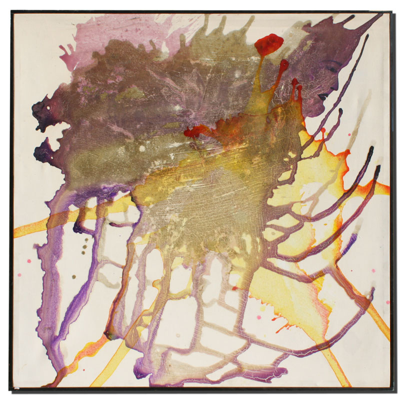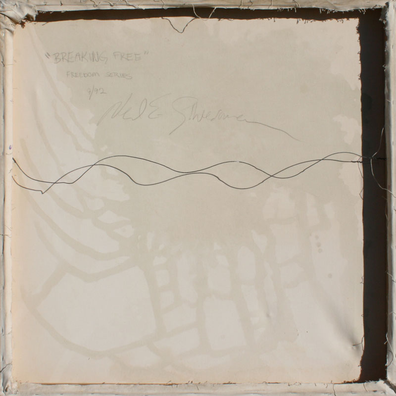 ABSTRACT OIL? ON CANVAS TITLED 'BREAKING FREE' FROM THE FREEDOM SERIES: 46'' x 46'', signed in pencil verso, illegibly dated 9-92, framed, 47 1/2'' x 47 1/2''.