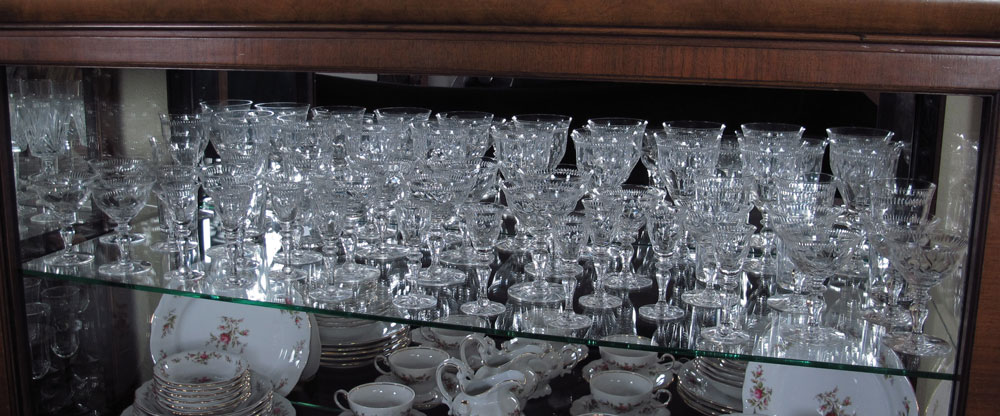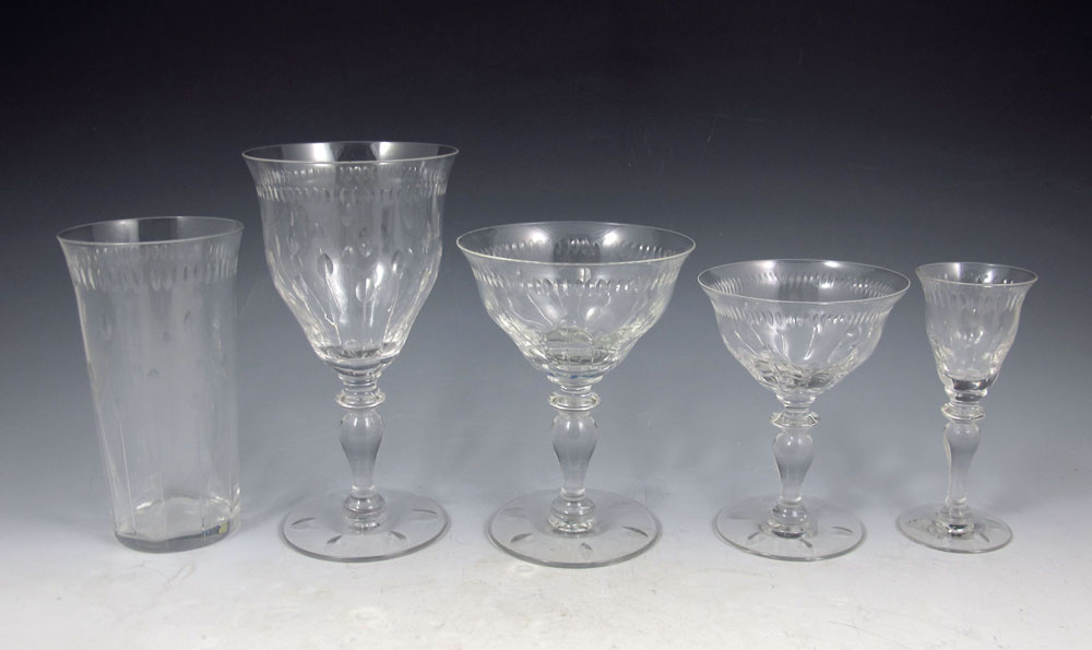 HAWKES ''DAWN'' PATTERN CRYSTAL: 45 piece partial service to include 10 water goblets (6 1/4''), 6 tumblers (5 1/4''), 11 cordials (4 1/2''), 12 wine (4 3/8''), and 6 wine (5'').