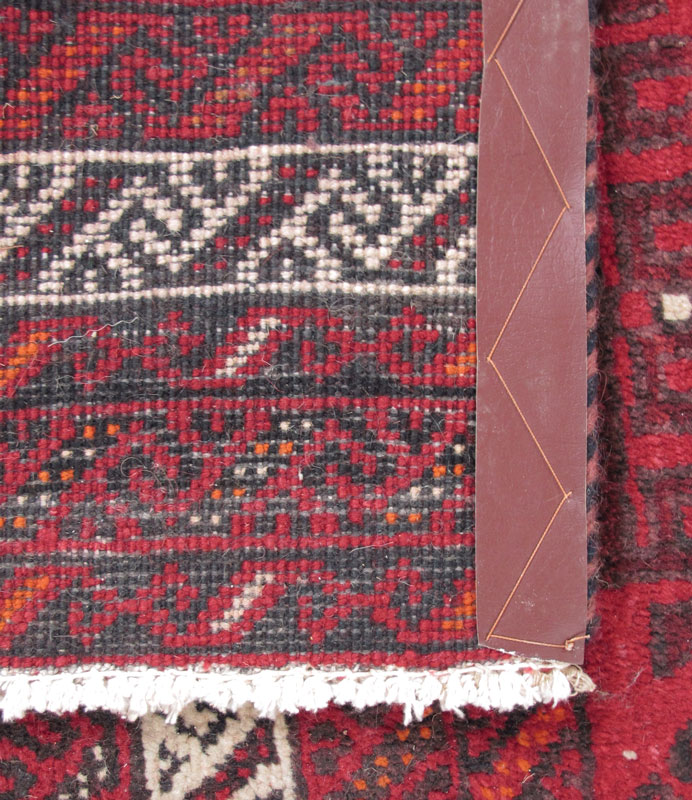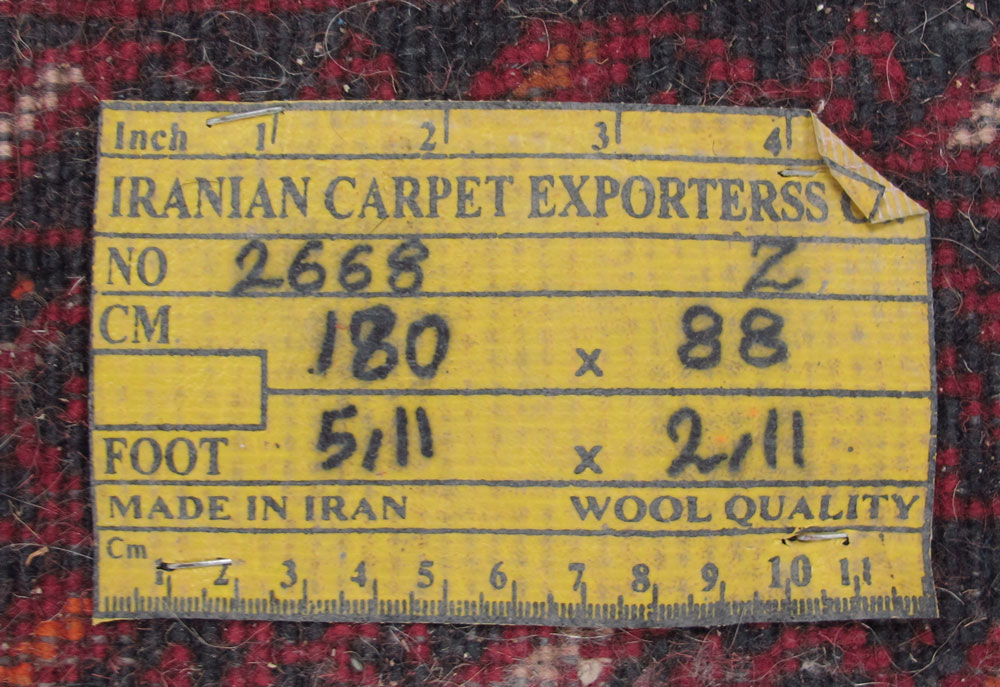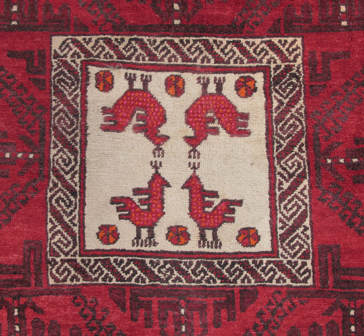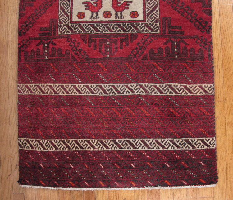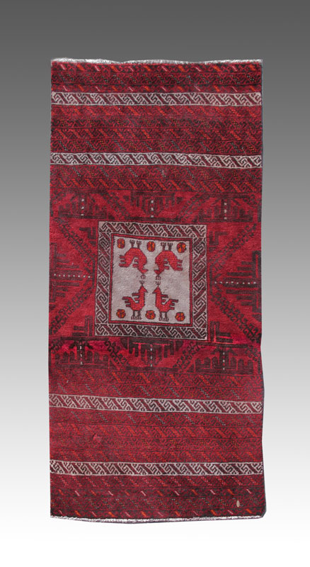 IRANIAN HAND KNOTTED WOOL TRIBAL RUG, 34'' x 5' 8'': This rug has an unusual format in its design that suggests that it was used for a special purpose. Possibly for use when serving special meals on special occasions. The central design consists of an ivory ground square with four birds, two facing each other on each side. The predominant colors are reds, blacks, and ivories, with all geometric motifs.