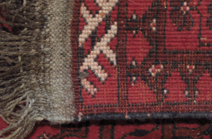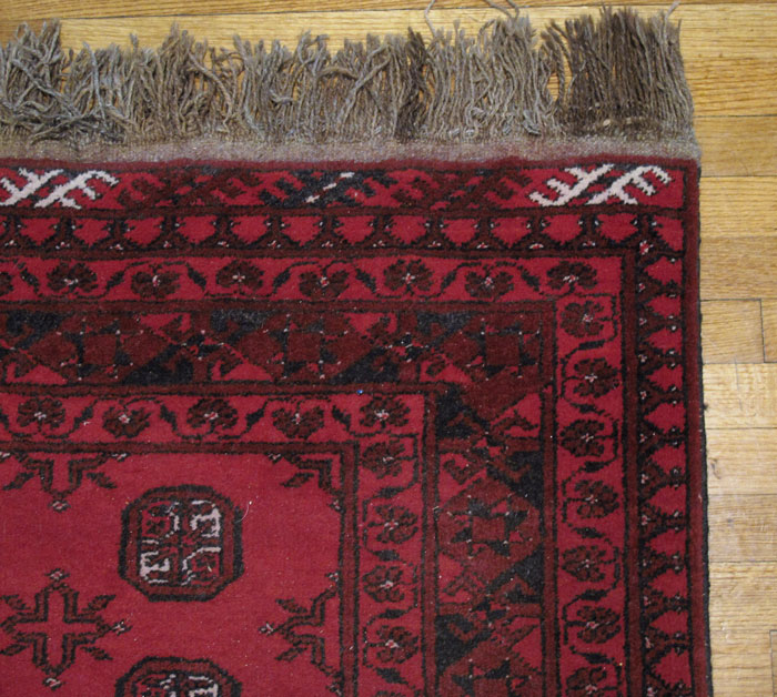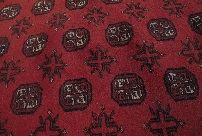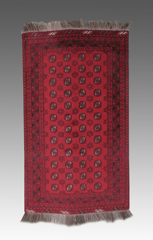 AFGHAN BOKARA HAND KNOTTED ORIENTAL RUG, 4' 9'' x 7' 9'': This, all wool, red ground rug has a traditional design of guls, also called an elephant foot, four across in rows over the whole field. This design is alternated with rows of a star like design and surrounded by many small borders. The condition of this rug is good and although it is a coarse weave, it would be a hardy rug to use in high traffic areas of your home or shop.