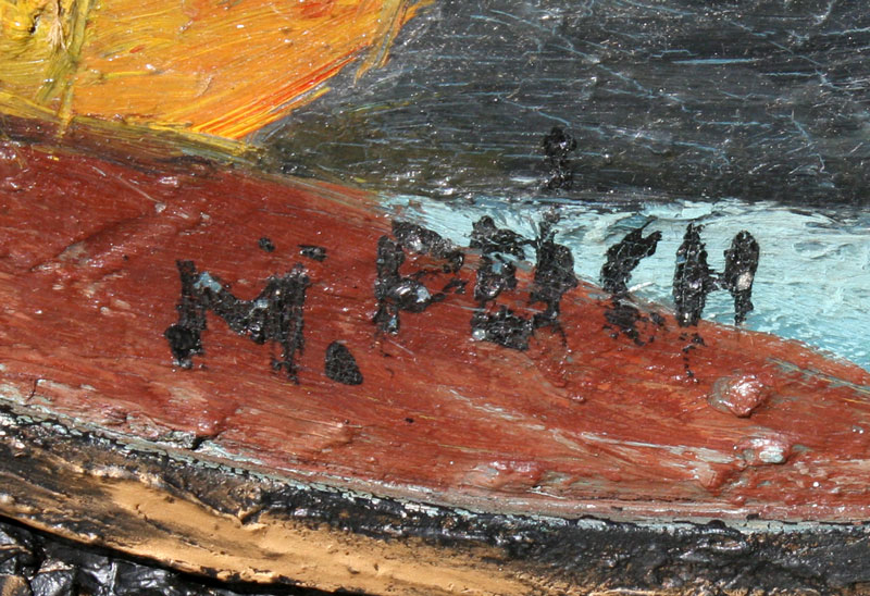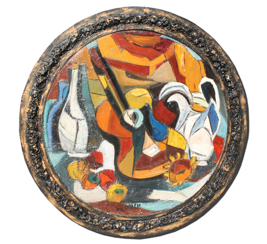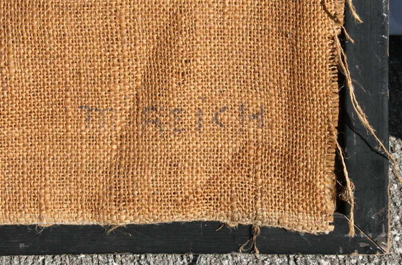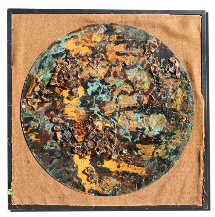 PAIR OF ABSTRACT COMPOSITIONS WITH MIXED MEDIA SIGNED M. REICH: 1) OIL/Paper, circular 36'' in diameter, laid to burlap matting and worn frame, 42'' x 42''. 2) OIL/Paper, 37'' in diameter approximately, in custom painted and constructed frame, 45'' in diameter.