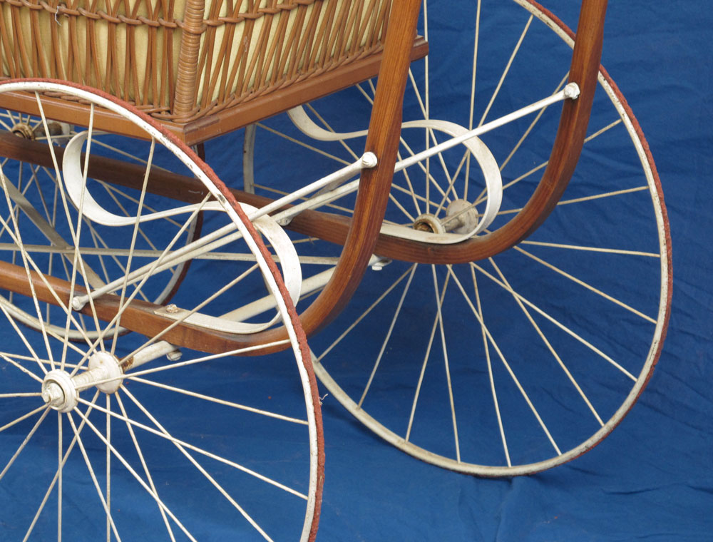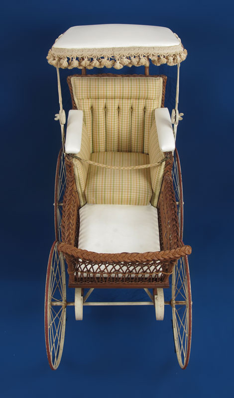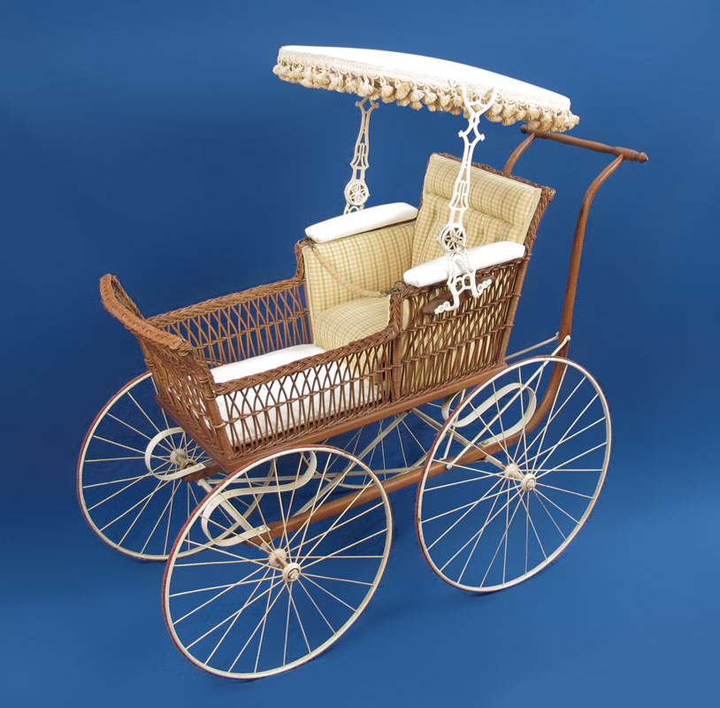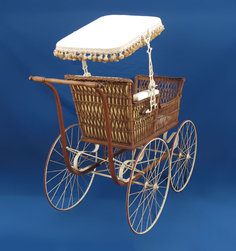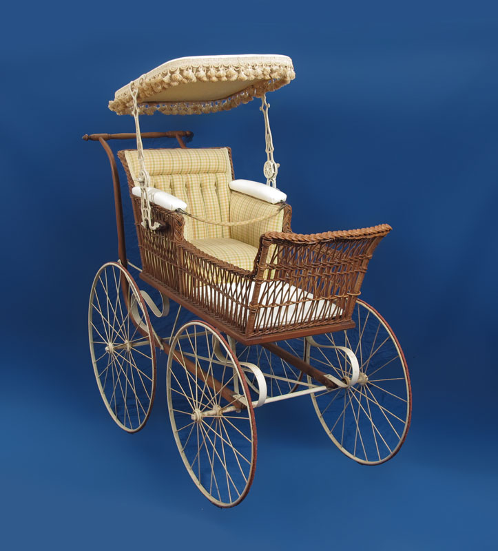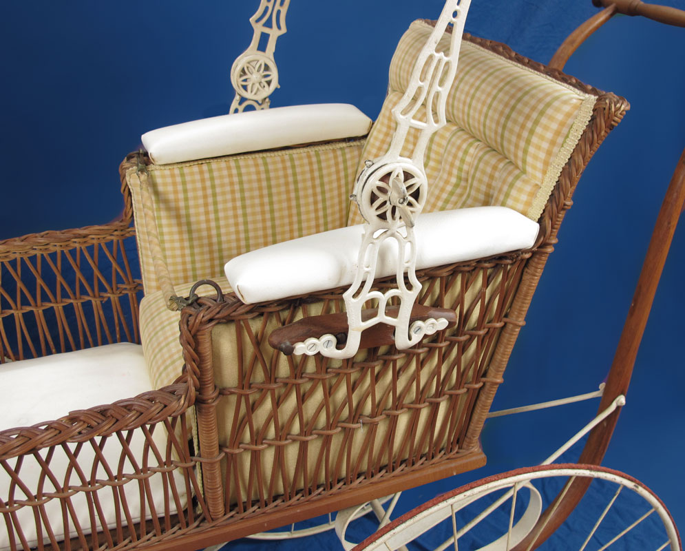 VICTORIAN WICKER BABY BUGGY: Wrought iron and brown wicker construction. 45'' to top of canopy x 25 1/2'' x 48''.