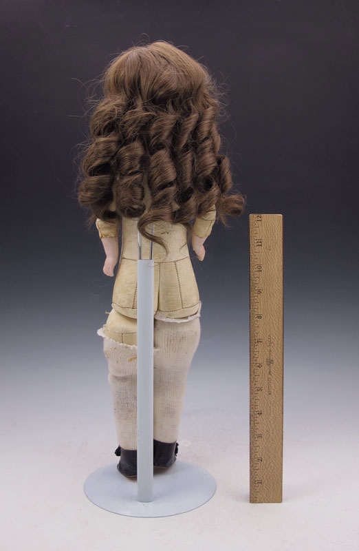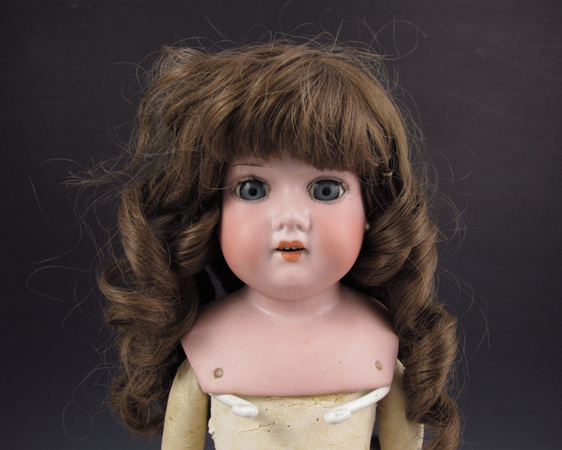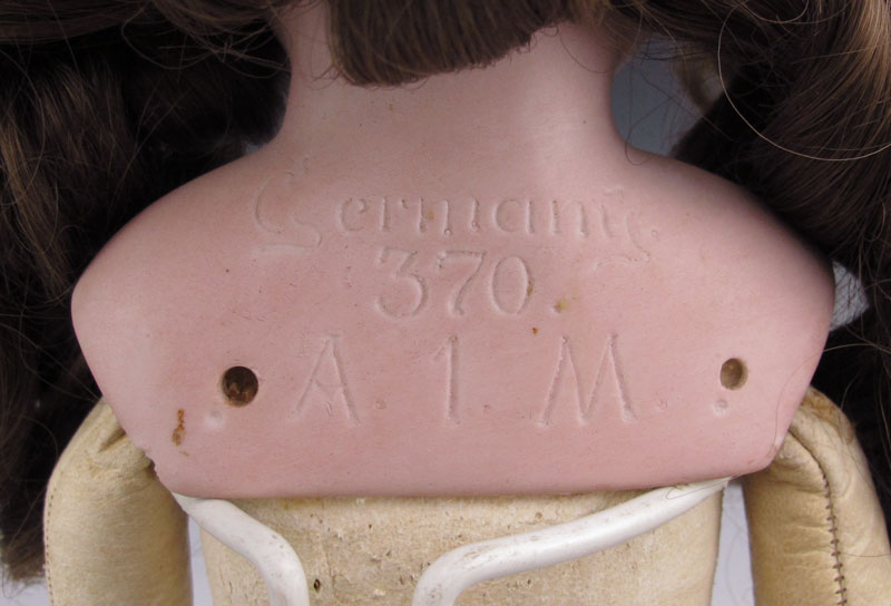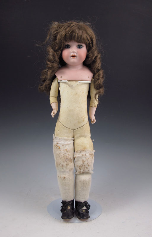 ARMAND MARSEILLE GERMAN BISQUE SHOULDER HEAD DOLL: Marked Germany 370 A.1.M. Open blue eyes with painted lashes, bright blush complextion, open mouth showing teeth, kid body, jointed limbs. 18'' tall.