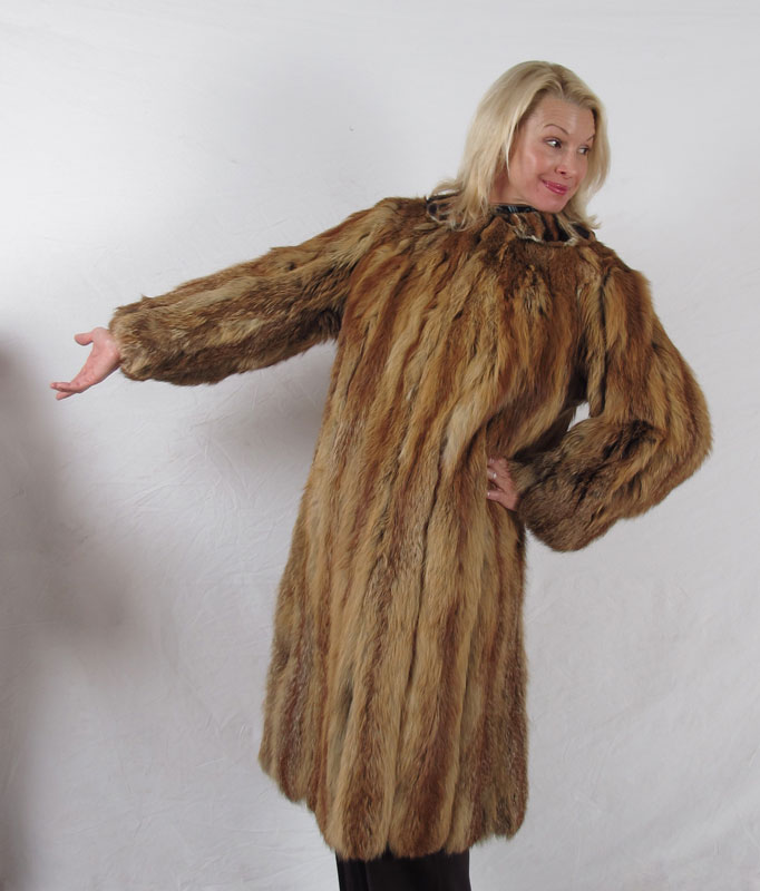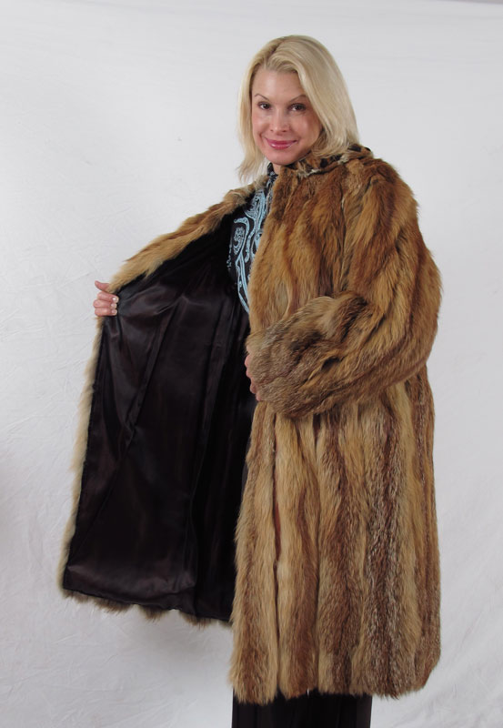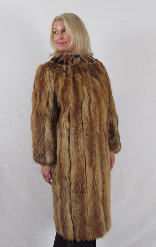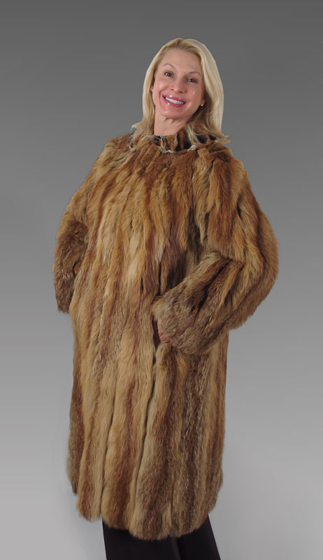 FULL LENGTH FUR COAT: With multi color striped pelt collar. approx. 43''l.