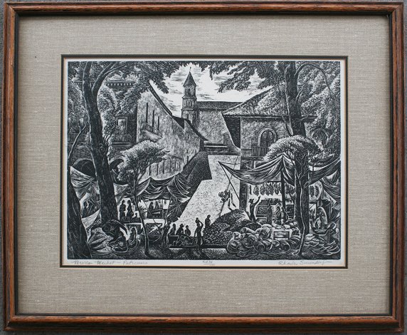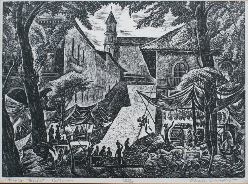 SURENDORF, Charles Frederick, (American, 1906-1979): ''Mexican Market - Patzcuaro'', Linocut, sight size 12 1/2'' x 17 1/2'', pencil signed, titled and marked edition of 100 in lower margin, original frame, 21'' x 26''.