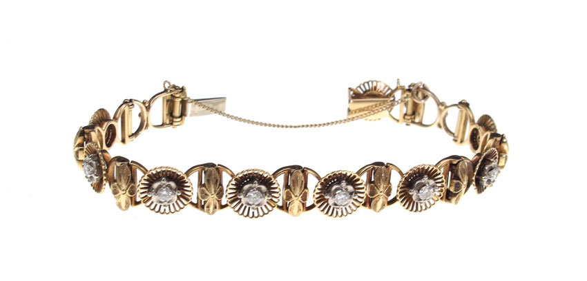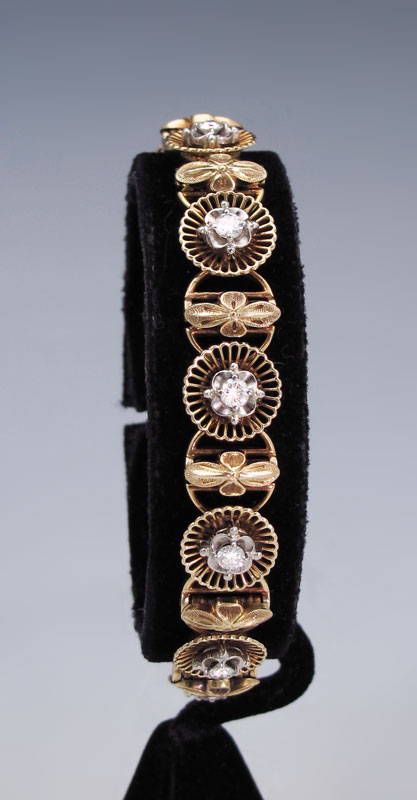 JABEL 18K DIAMOND BRACELET: 18K yellow golf bracelet of nine round brilliant cut diamonds, total approx. 1 Ct., rated VS in clarity and G-H color. The diamonds are prong set. Locking closure with safety chain. Approx. size 7''l. .5'' wide. Weight 29.7 grams. Signed Jabel. Sold with current Florida Diamond Appraisers GIA graduates appraisal for $4,750.
