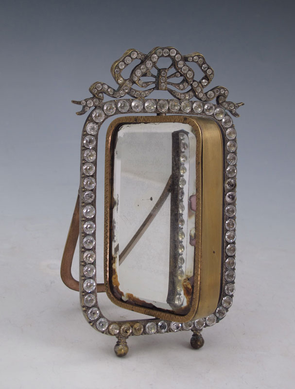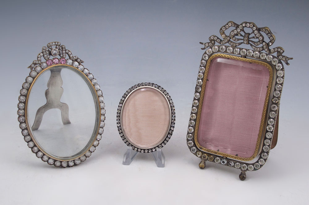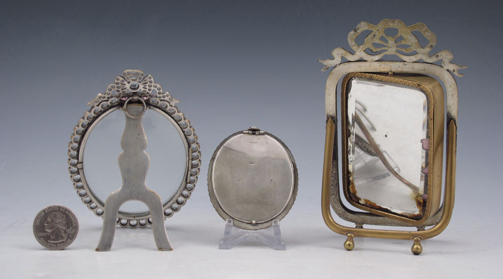 GROUP OF 3 FRENCH PASTE PICTURE FRAMES: 1)Pivots from mirror to frame. 5 1/4'' x 3 1/4''. Note silver loss to mirror. Easel back. 2) 900 silver back oval frame, to be worn as a pendant. 2 7/8'' x 2''. 3) Easel back with ribbon design top. 4 1/4'' x 3 1/8''.