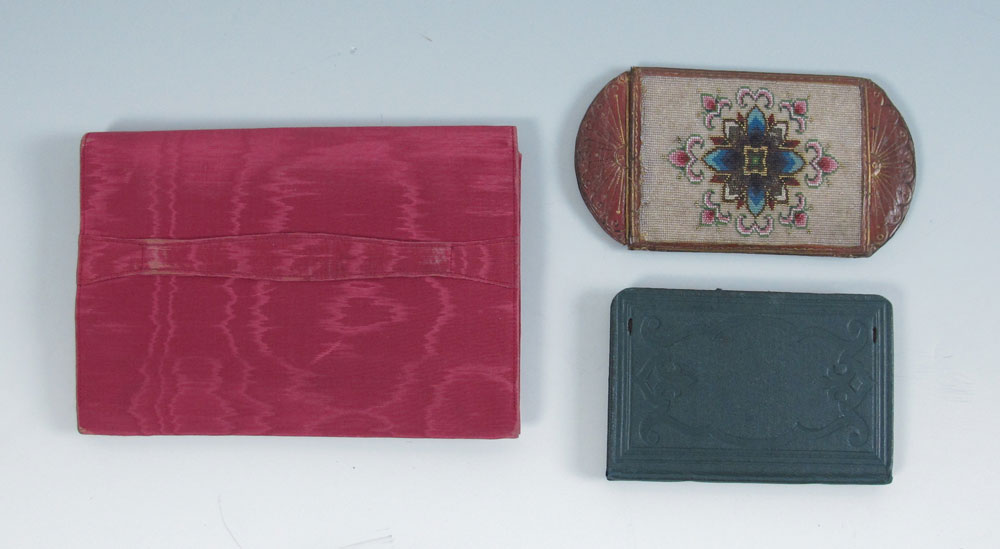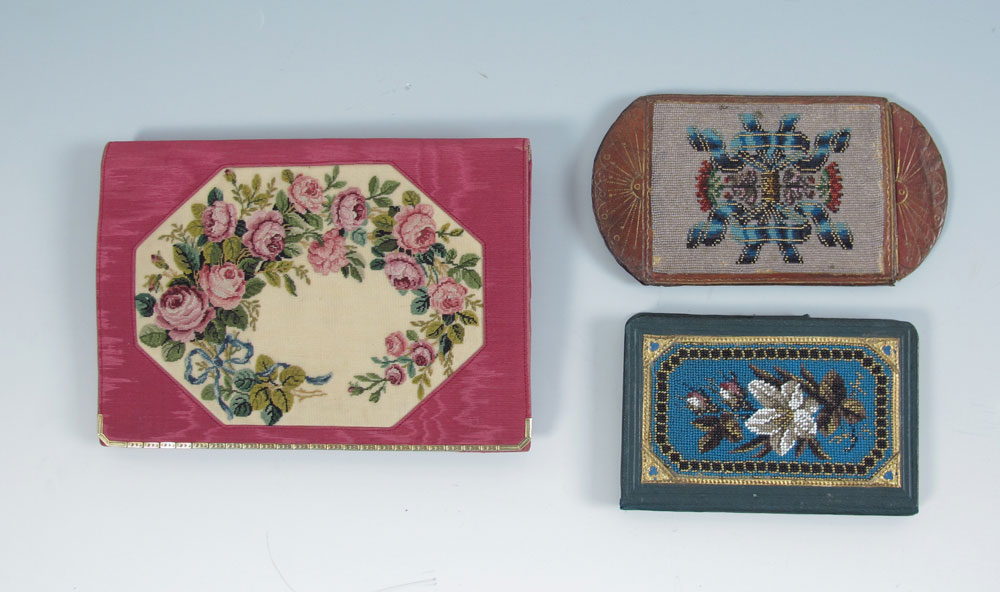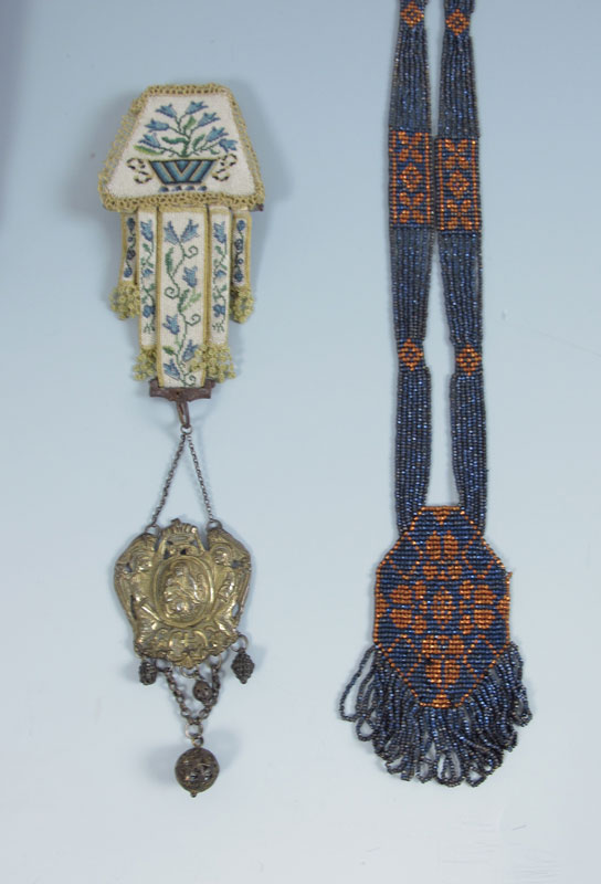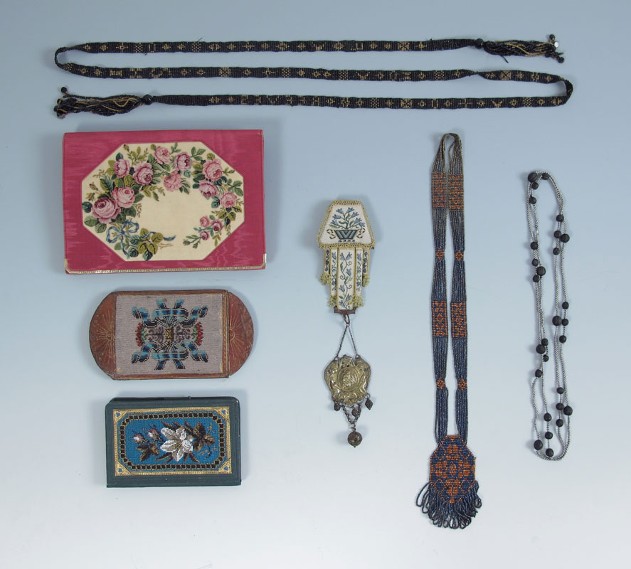 EXQUISITE COLLECTION OF BEAD WORK: To include pouch, date book, belt. chatelaine.