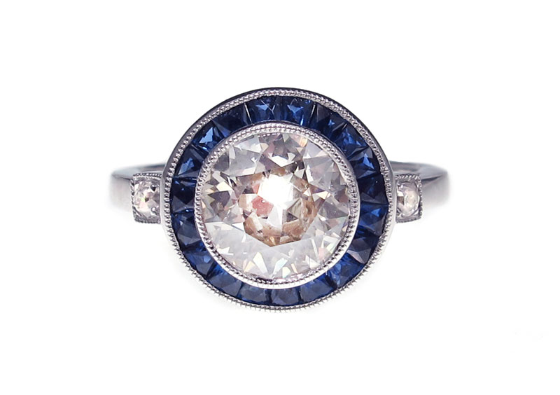 SOPHIA D PLATINUM DIAMOND AND SAPPHIRE RING: Platinum Art Deco revival ring centering a bezel set Old European Round cut diamond, approx. 1.75 Ct., rated VSI in clarity, Top Light brown in color. The diamond is framed by 19 French cut sapphires, approx. .82 Ct., VS in clarity B Hue, 6-7 tone and 4 in saturation. Two old European diamonds on either end, approx. .07 Ctw., Vs in clarity and I-J color. Signed Sophia D. numbered 1685B. Sold with current Atlanta Gemological Laboratories GIA graduates appraisal for $8,350.