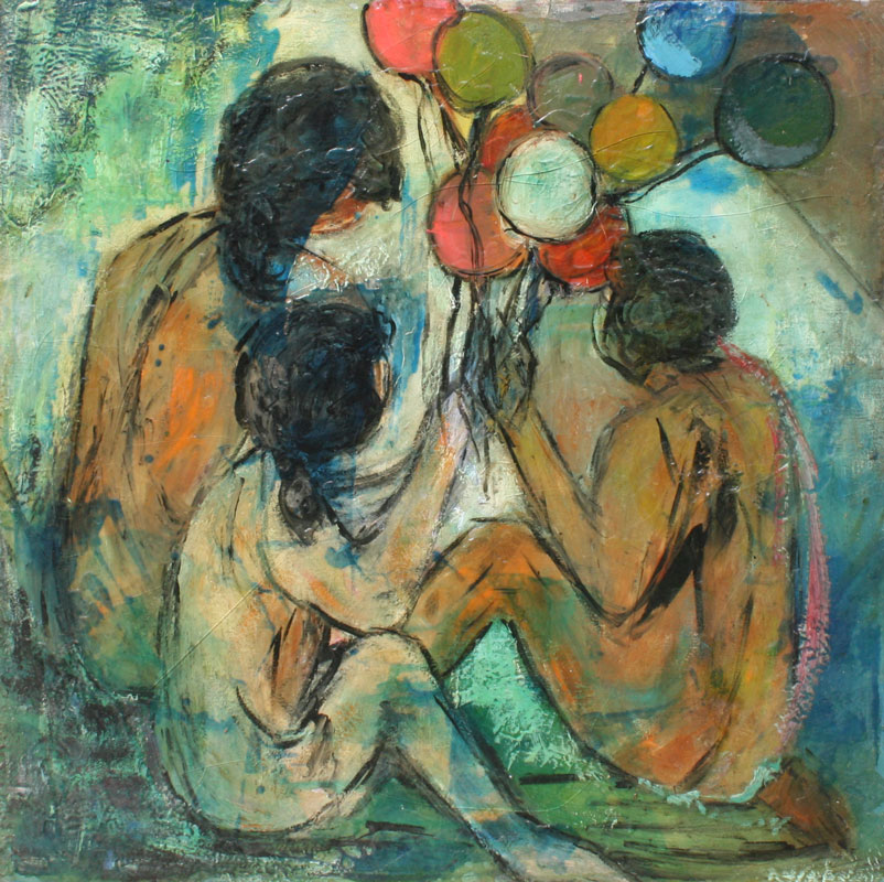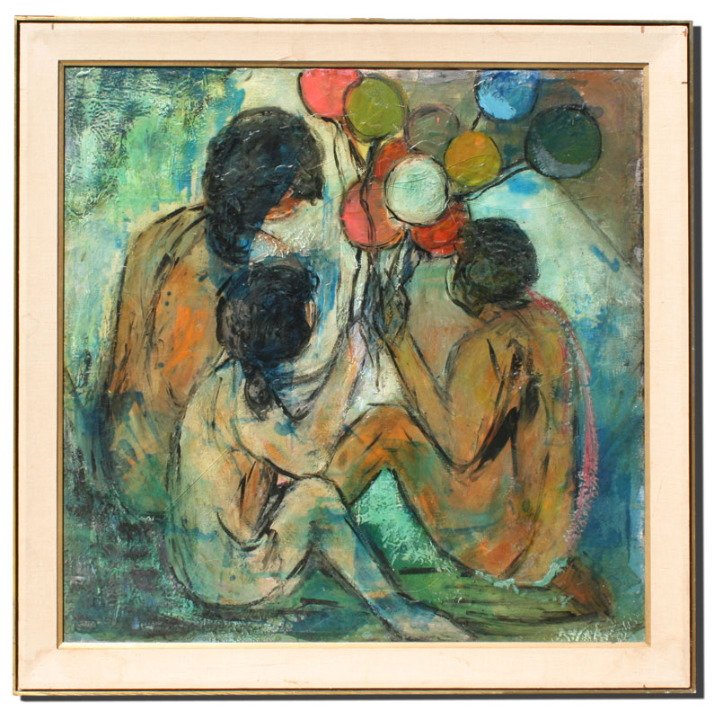 LARGE ABSTRACT OIL ON PAPER LAID ON CANVAS? THREE FIGURES AND BALLOONS: No visible signature, 40'' x 40'', framed, 46'' x 46''.