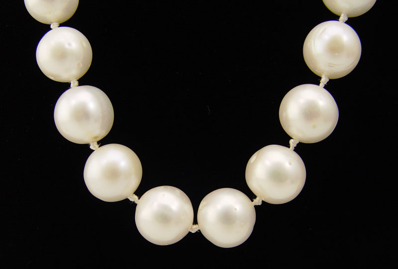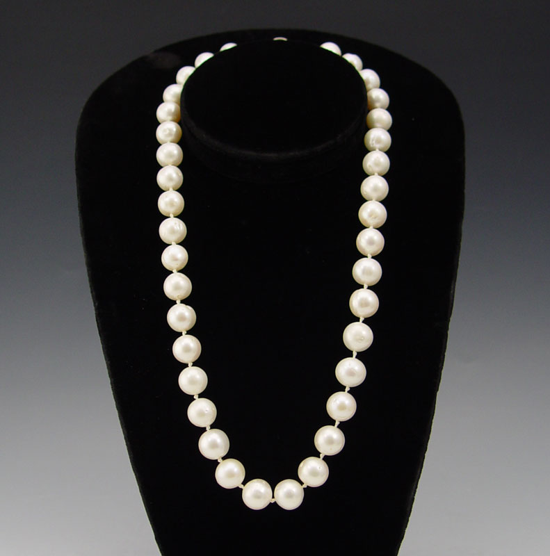 10MM PEARL STRAND NECKLACE; Stand of 18'' 10.00 mm cultured freshwater pearls. White in color, blemished, medium/high luster. Filigree metal clasp.