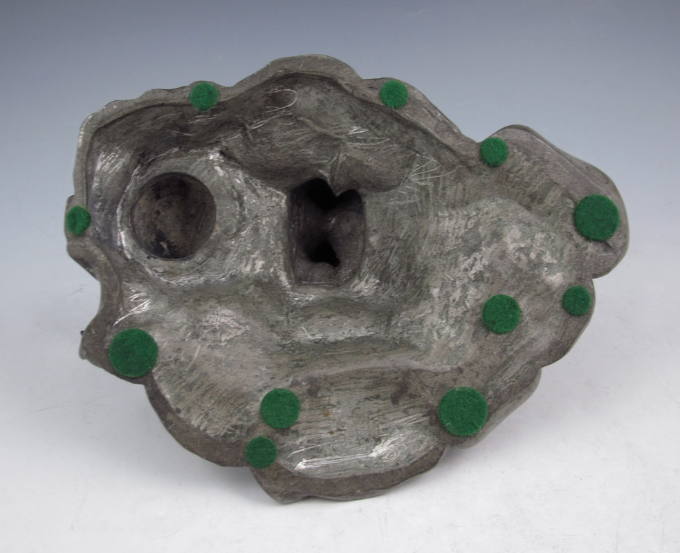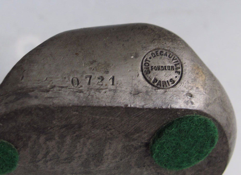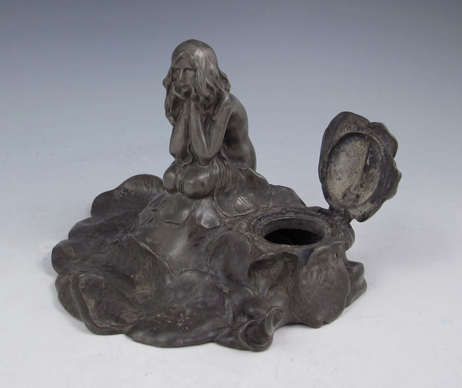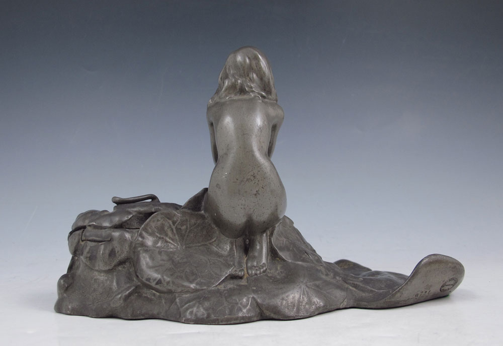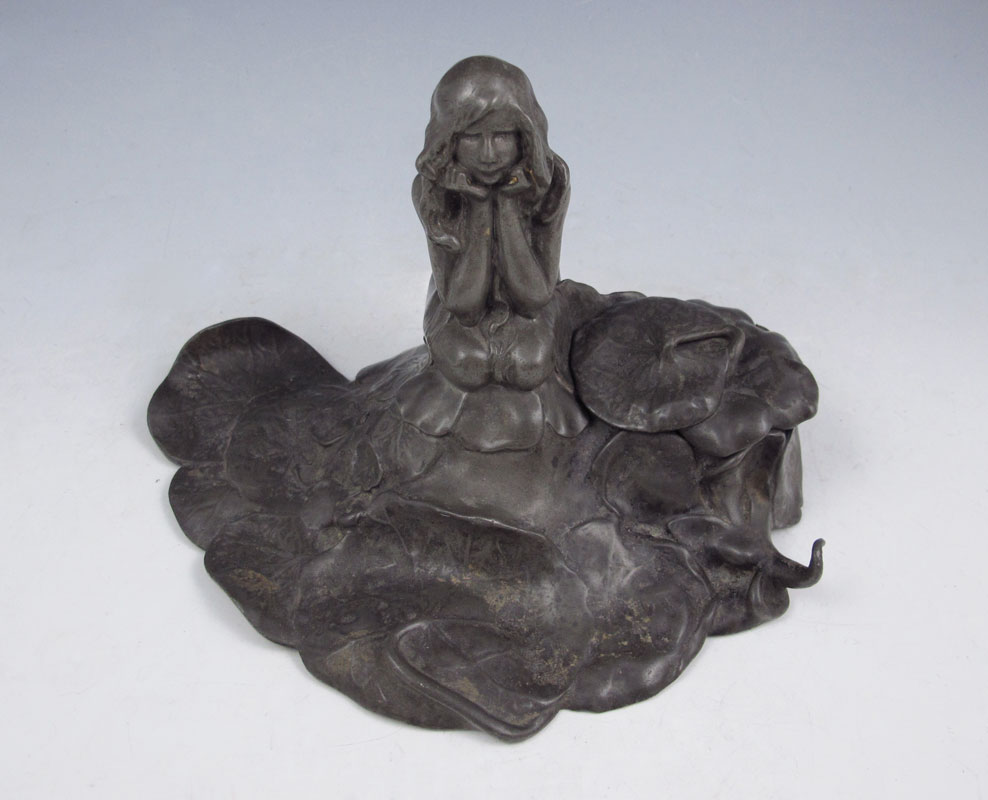 CLERGET, ALEXANDRE, (French, 1859-1931): Young Female Nude Among Lily Pads, Spelter Inkwell, 4 1/2'' h., 7 1/2'' w., incised signature, foundry mark SIOT-DECAUVILLE, with glass insert.