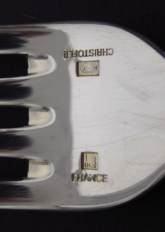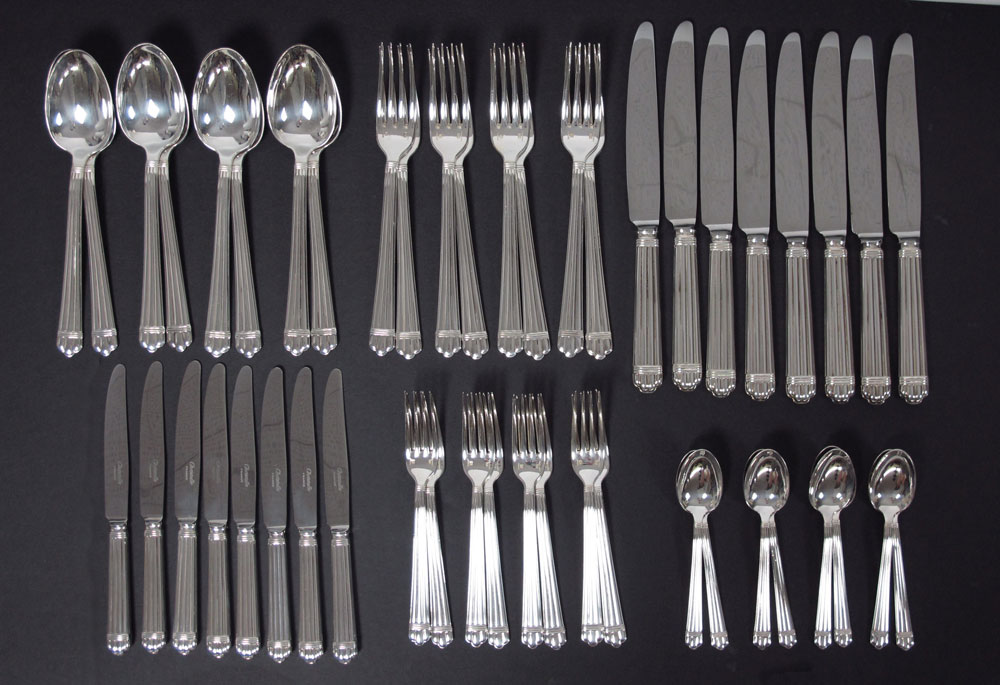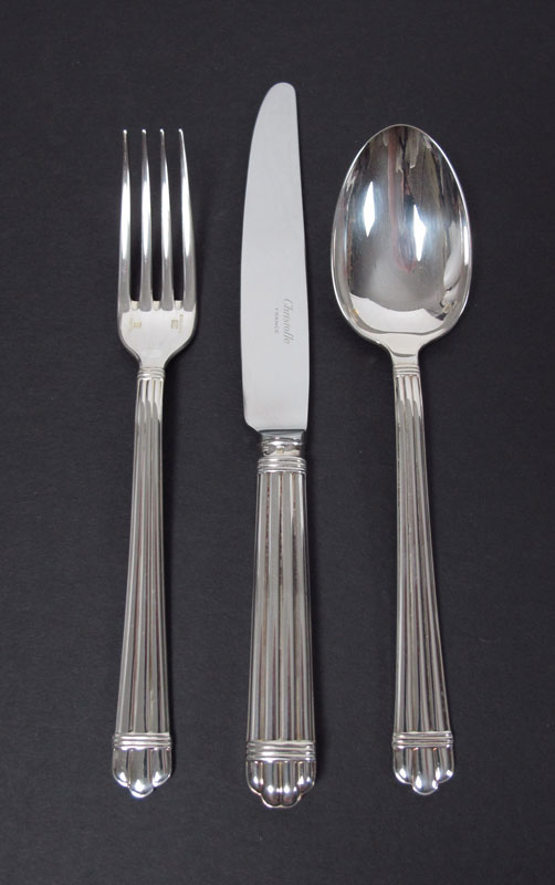 CHRISTOFLE ARIA SILVERPLATE FLATWARE SERVICE FOR 8: 48 pieces in the Aria pattern by Christofle, Paris in the Aria pattern to include 8 complete settings of 6 to include forks (8 1/8''), salad forks (6 3/4''), teaspoons (5 1/4''), tablespoons (8 1/8''), knives (9 3/4''), smaller knives (7 3/4''). Come in original tan suede holders.