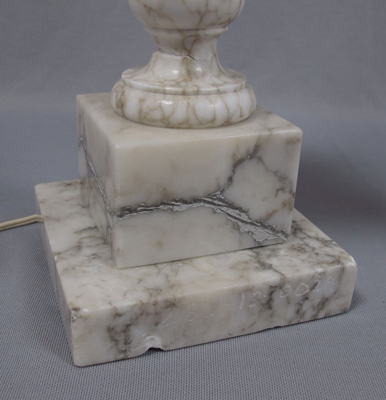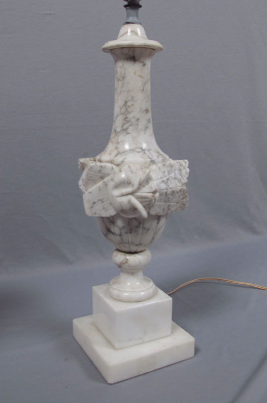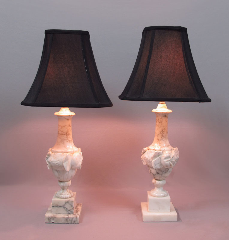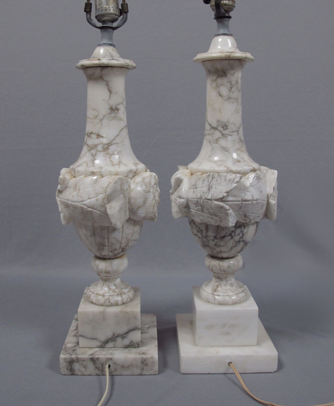 PAIR CARVED MARBLE TABLE LAMPS: Approx. 35'' tall overall. Sold with the black shades.