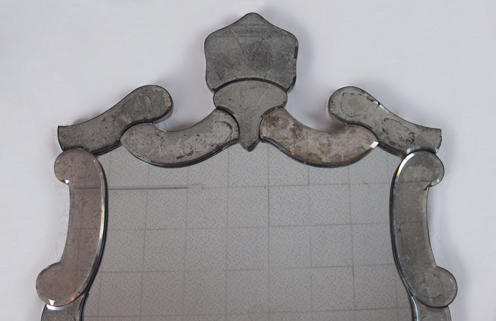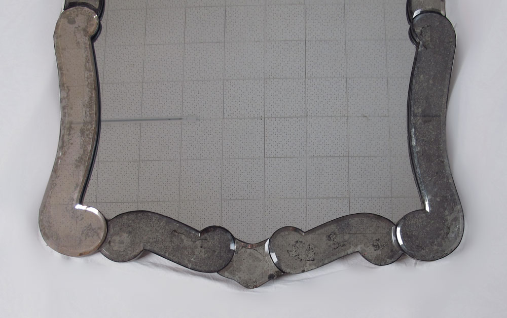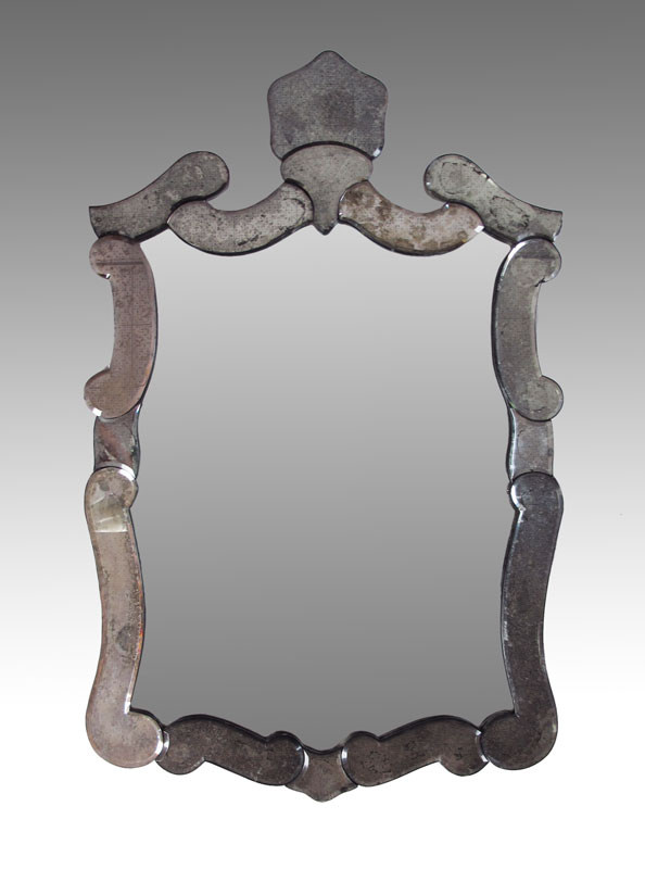 HIGH STYLE ANTIQUED VENETIAN BEVELED GLASS MIRROR: 45'' h x 29'' w.