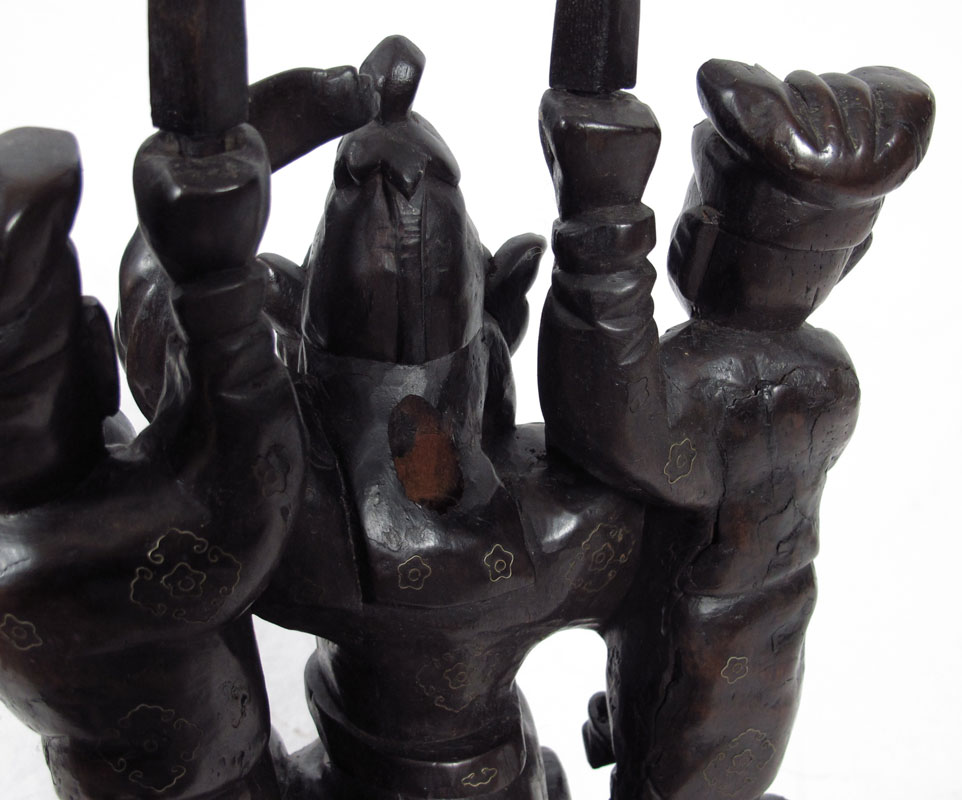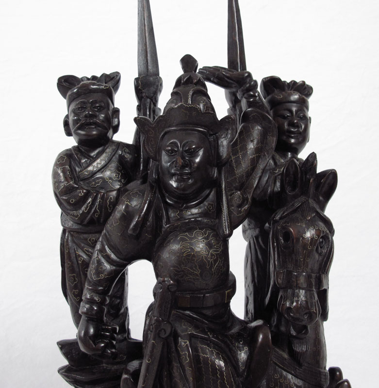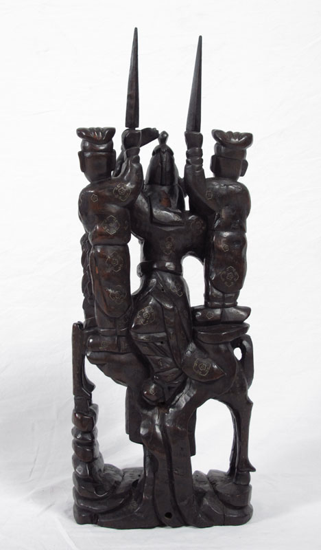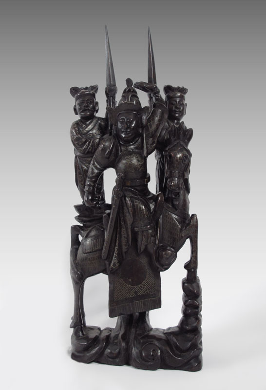 INLAID CARVED WOOD ORIENTAL WARRIOR: Oriental warrior on horse with 2 servants holding staffs, inlaid with metal. Age unknown. 24 1/4'' h. x 9 1/2'' x 5''.
