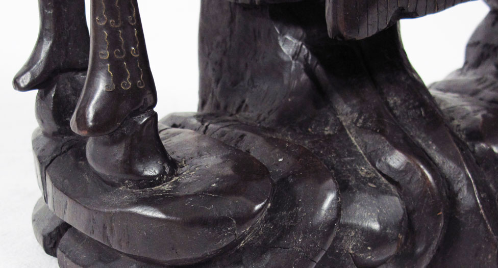 CONDITION: Note chip to base, repair to servant's hand, missing inlay.