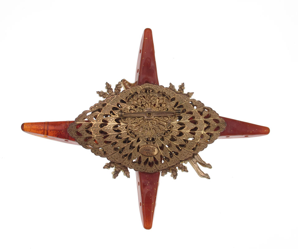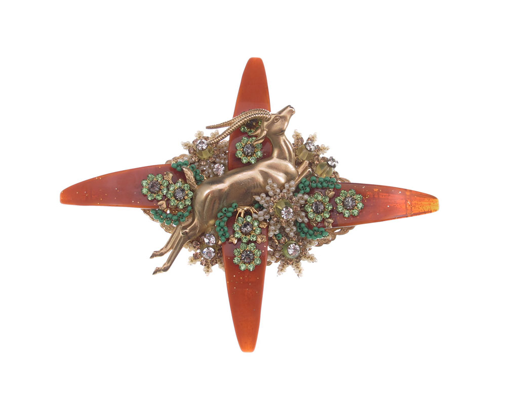 STANLEY HAGLER GAZELLE BROOCH: Metal gazelle with glass and plastic beads. Signed Stanley Hagler NYC. 5 1/2''l. x 4 1/2''.