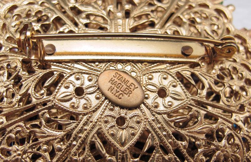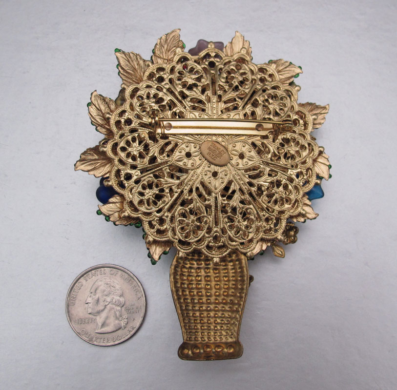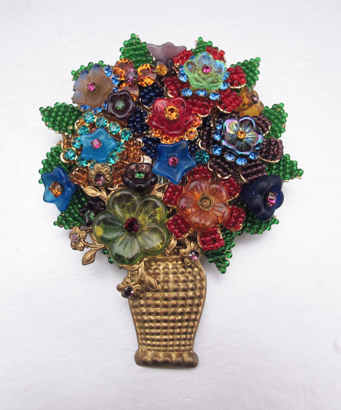 STANLEY HAGLER FLOWER VASE BROOCH: Metal vase with brightly colored glass and plastic beads. Signed Stanley Hagler NYC. 3 3/4''.