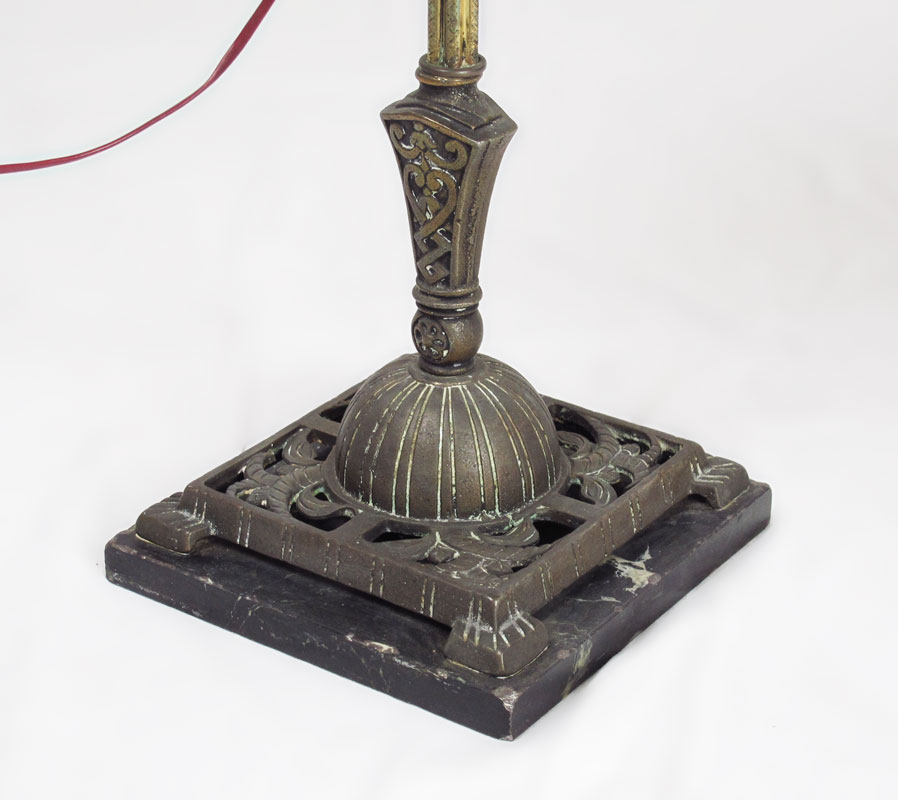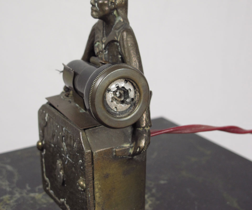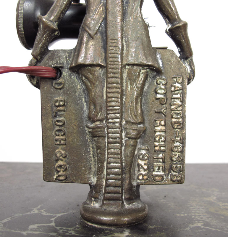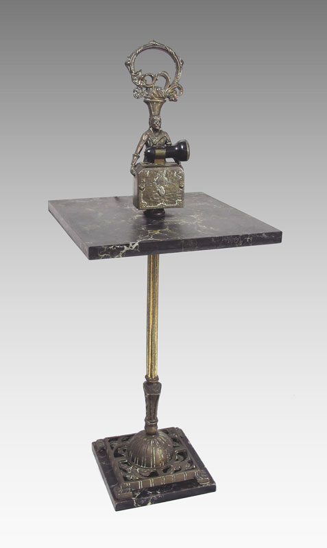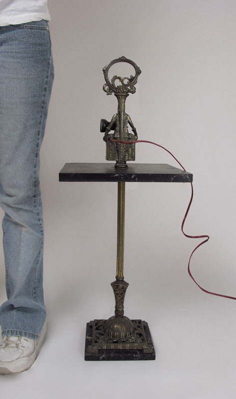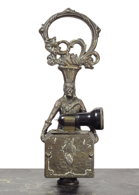 BLOCK & CO. FIGURAL INDIAN SMOKING STAND: Cast metal figural Indian handle with electric lighter attachment. Marble base and shelf. 31 1/2'' h. x 12'' square.