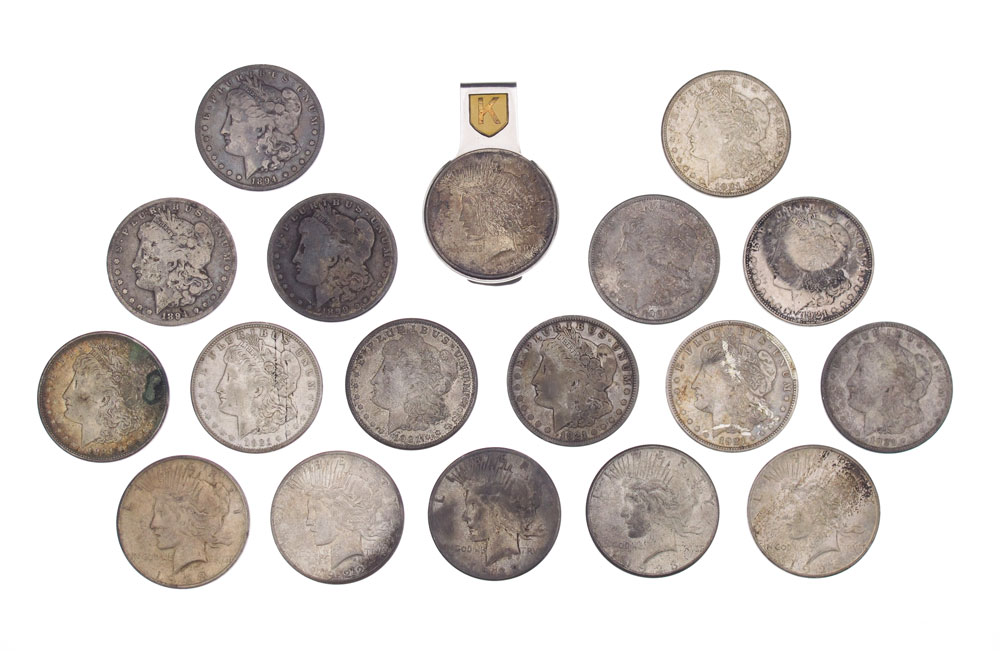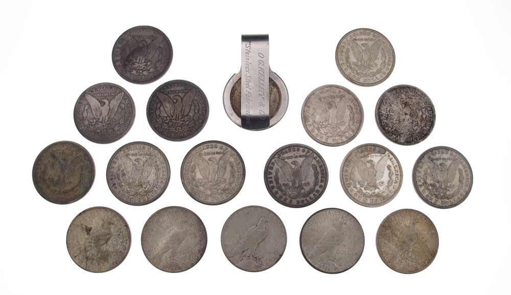COLLECTION OF 18 MORGAN & PEACE DOLLARS: Morgans to include 1894-O, 1894, 1899-O, 5 1921, 4 1921-S. Peace to include 2 1922-S, 1922, 1923, 1924 (set into moneyclip), 1926. Ungraded.