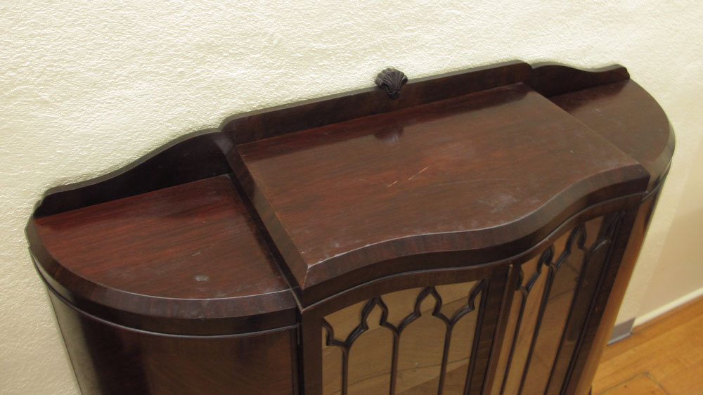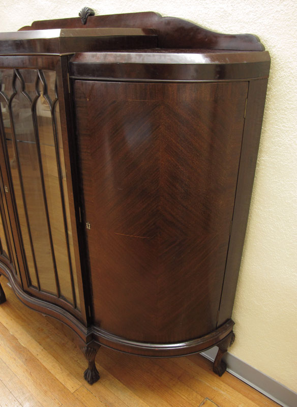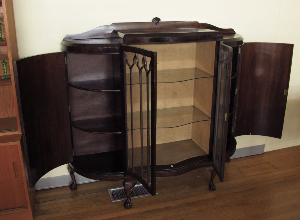 1920's ART DECO SERPENTINE FRONT CURIO CHINA CABINET: 2 glass front doors with 2 glass shelves, 2 solid side doors on 4 paw feet. 54 3/4'' h. x 58 3/4'' x 18 1/2''.