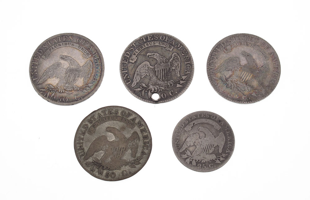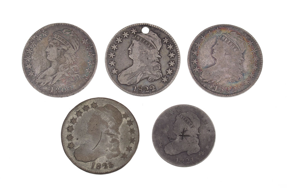 4 CAPPED BUST US SILVER HALF DOLLAR COINS: To include 1808, 2 1822, 1825. Ungraded. Sold with a 1821 Capped Bust Quarter.