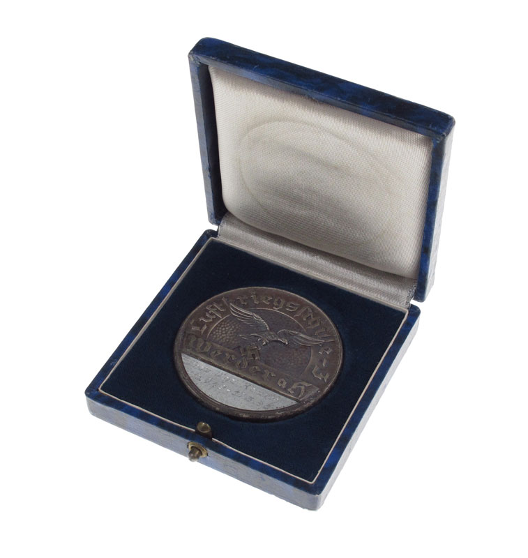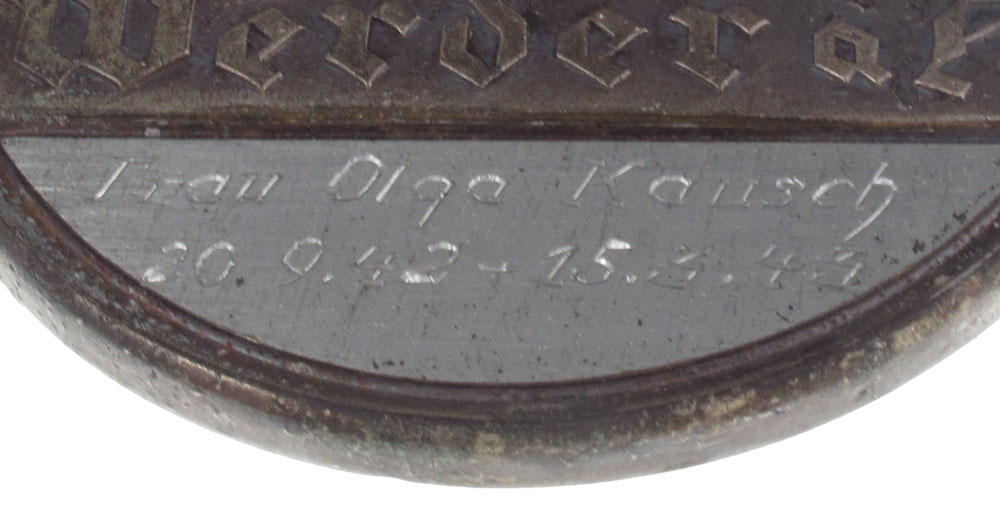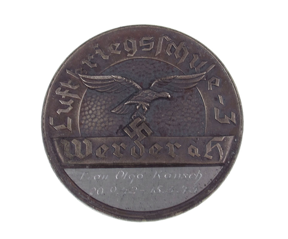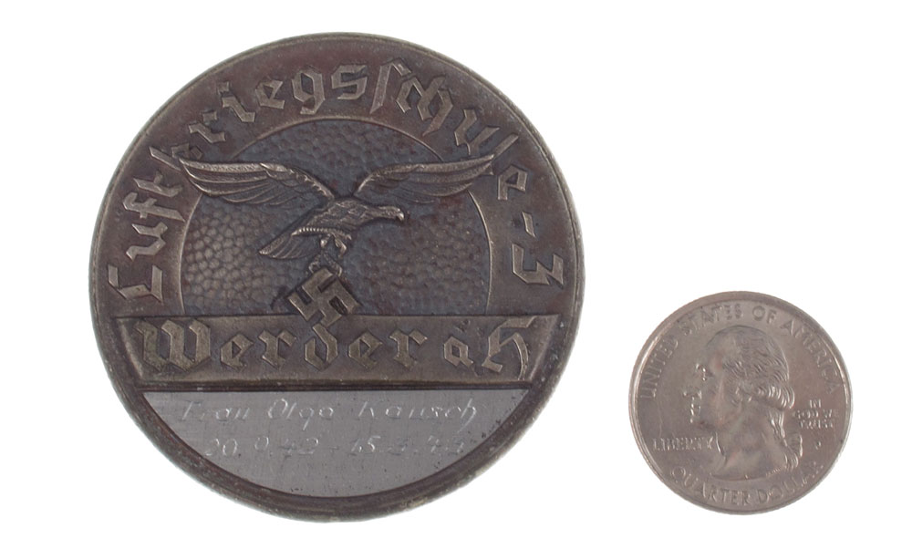 WWII GERMAN AIR WAR COLLEGE 3 MEDALLION: Identification medallion for teacher or student Frau Olga Kaush dated 20.9.42-15.3.43.. German Air Force eagle with swastika on front, Commanders signature reverse. 2 1/8'' dia.