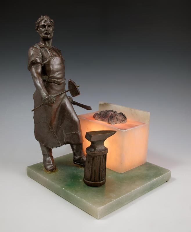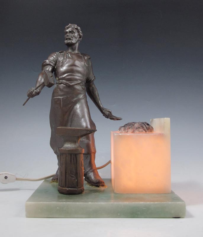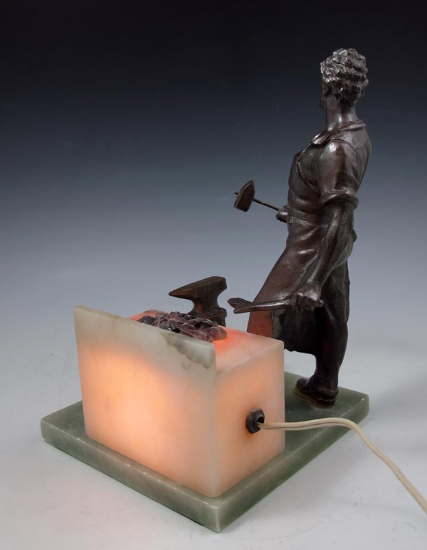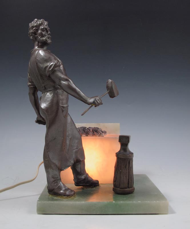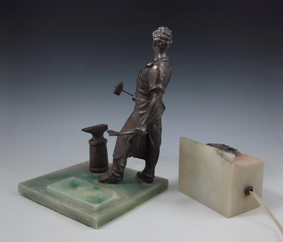BLACKSMITH FIGURAL LAMP: Bronzed metal figure and anvil, the translucent alabaster forge emulating the burning embers of the blacksmiths fire. 11 1/2'' tall x 7 1/2'' x 7 1/4''.
