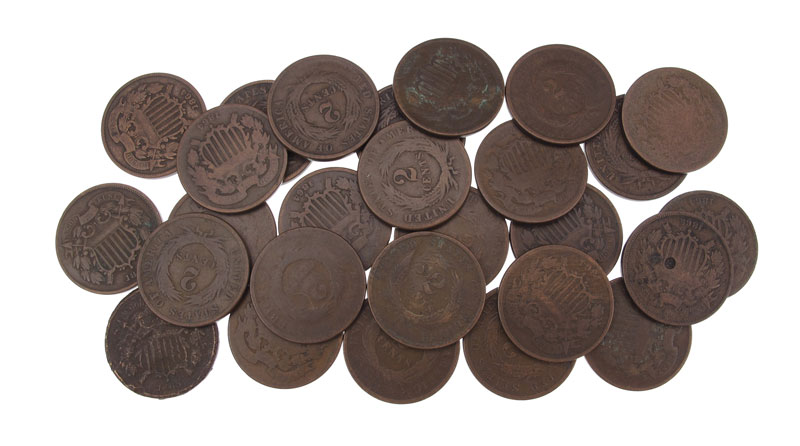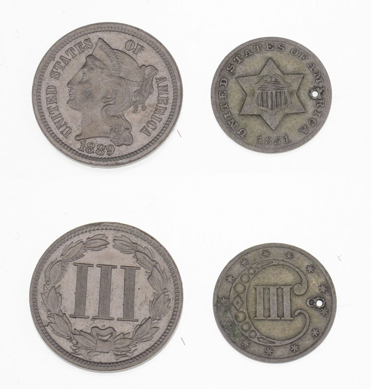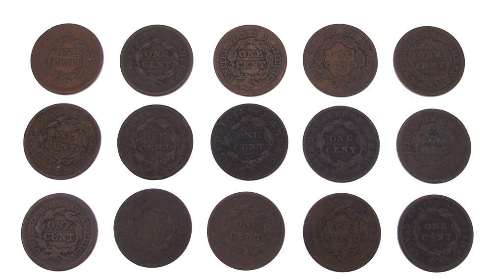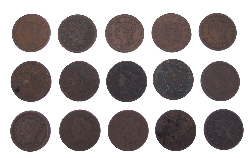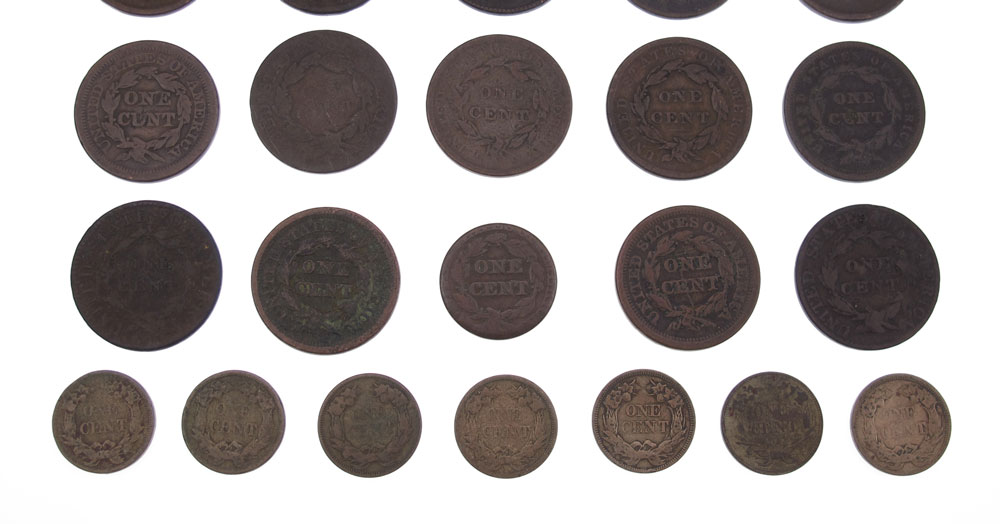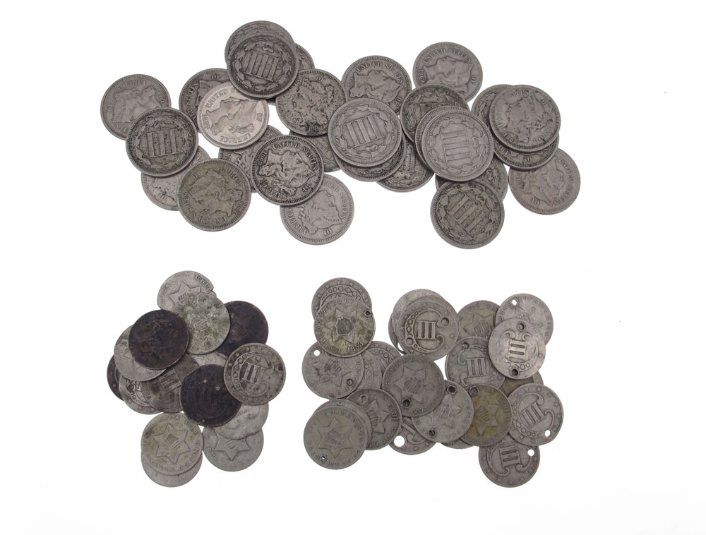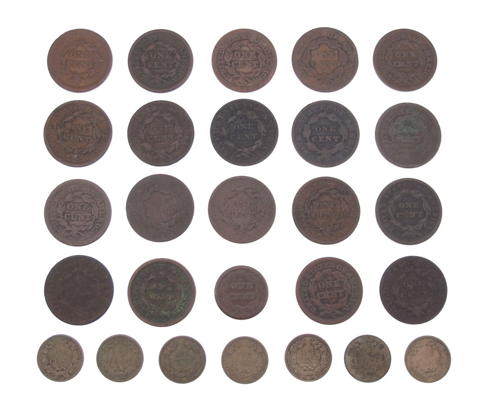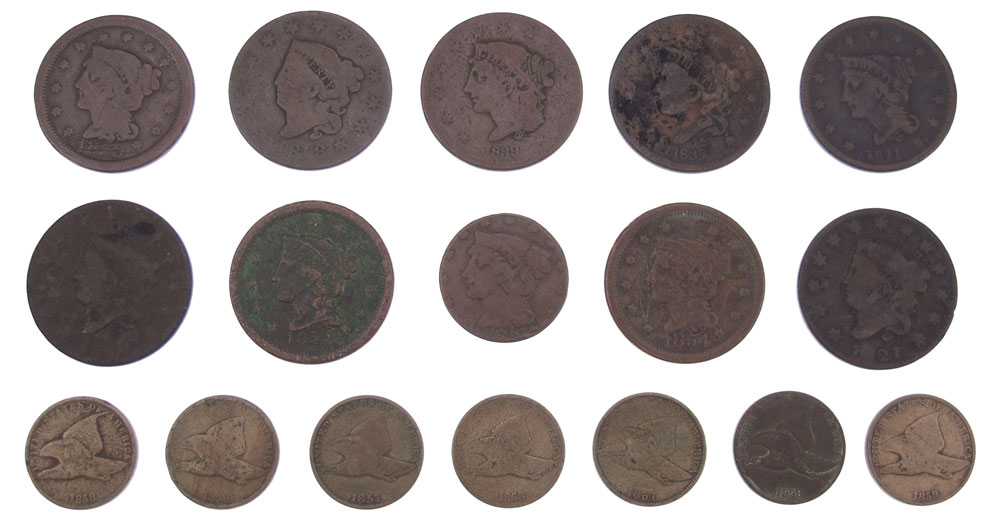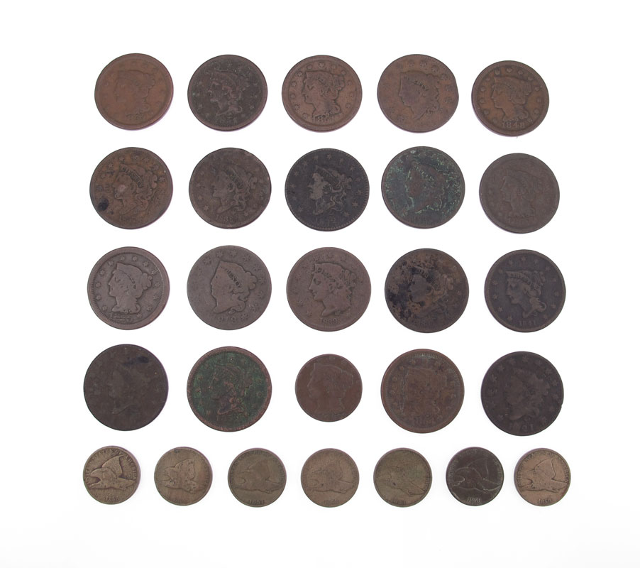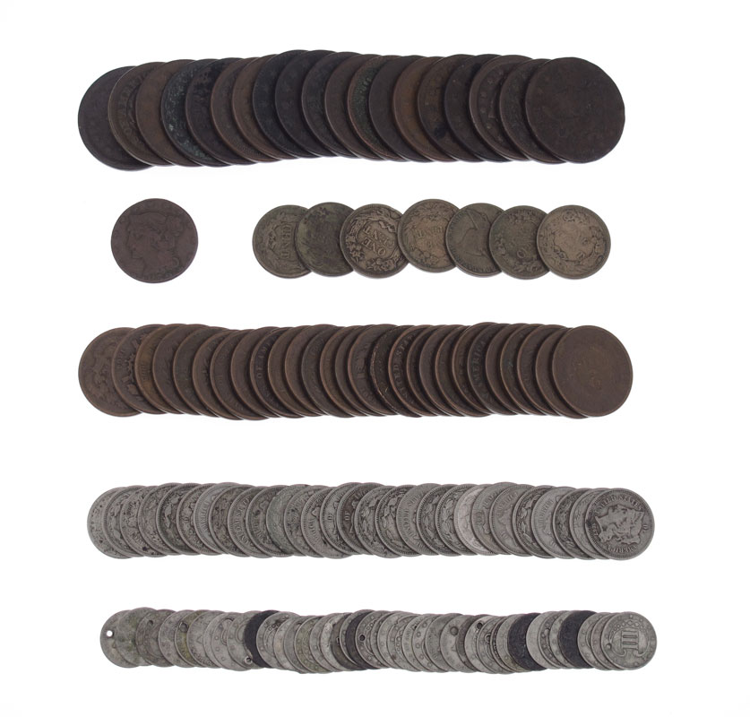 COLLECTION OF 3, 2 AND 1 CENT PIECES: To include 1) Approx 39 1851-1853 silver 3 cent, 6 1851, 12 1852, 5 1853, 16 unreadable date. Note holes and condition on these. 2) Approx. 28 1865-1889 nickel 3 cent, 12 1865, 3 1866, 3 1867, 2 1868, 3 1869, 1870, 1873, 1875, 1881, 1889. 3) Approx. 27 2 cent, 16 1864, 3 1865, 1967, 2 1868, 1869, 1970, 3 unreadable. 4) 10 Coronet Head large cent, 1818, 1820, 1821, 2 1832, 1834, 2 1837, 1838, 1839. 5) 10 Braided Hair large cent, 1841, 1848, 2 1851, 3 1852, 1853, 1854, 1 unreadable. 6) Flying eagle cent, 2 1857, 5 1858. Ungraded.
