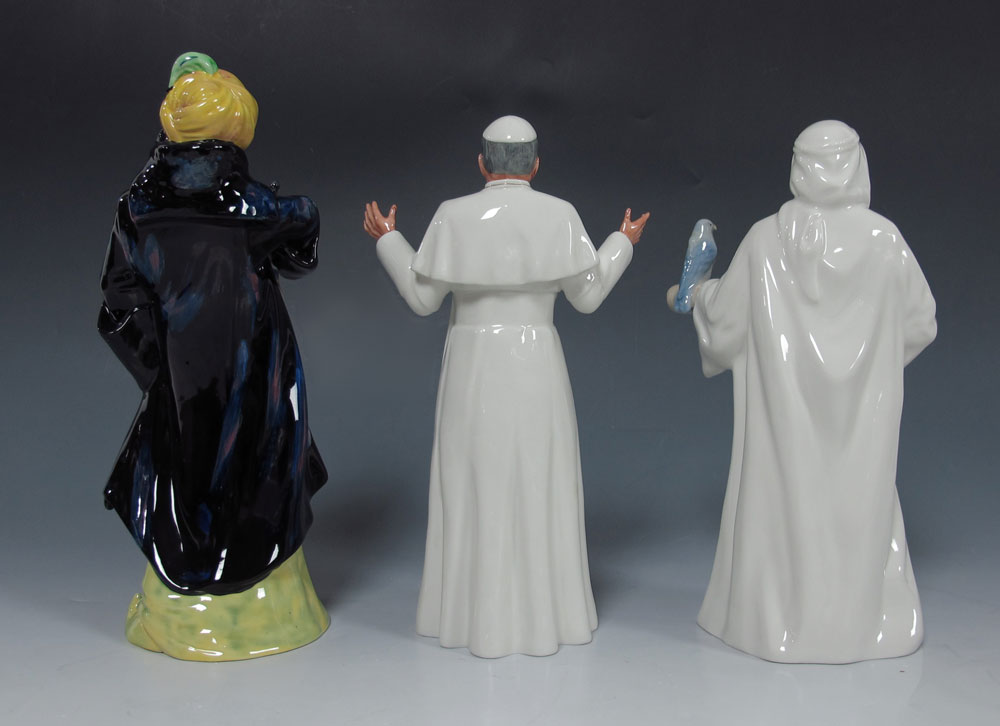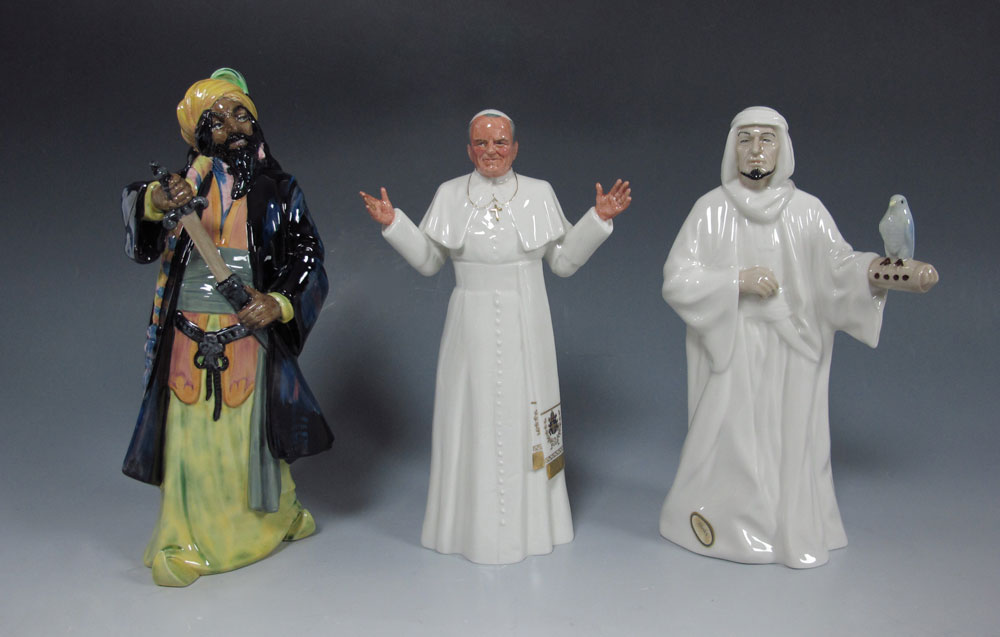 3 ROYAL DOULTON FIGURINES: ''Blue Beard'' HN 2105, 11''; ''His Holiness John Paul II'' HN 2888, 10''; and ''Sheikh'' HN 3083, from the Reflections Series.