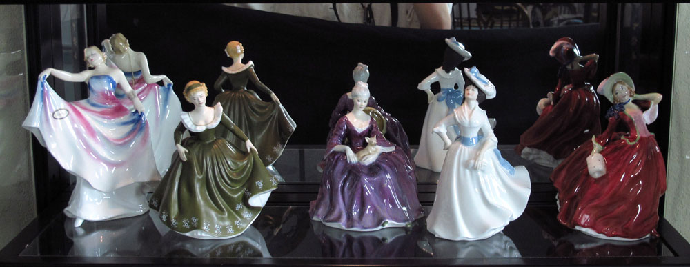 5 ROYAL DOULTON FIGURINES: ''Liberty'' HN 3201, 8 1/2''; ''Geraldine'' HN 2348, matt finish to dress; ''Charlotte'' HN 2421, purple dress; ''Margaret'' HN 2397; and ''Autumn Breezes'' HN 1934.