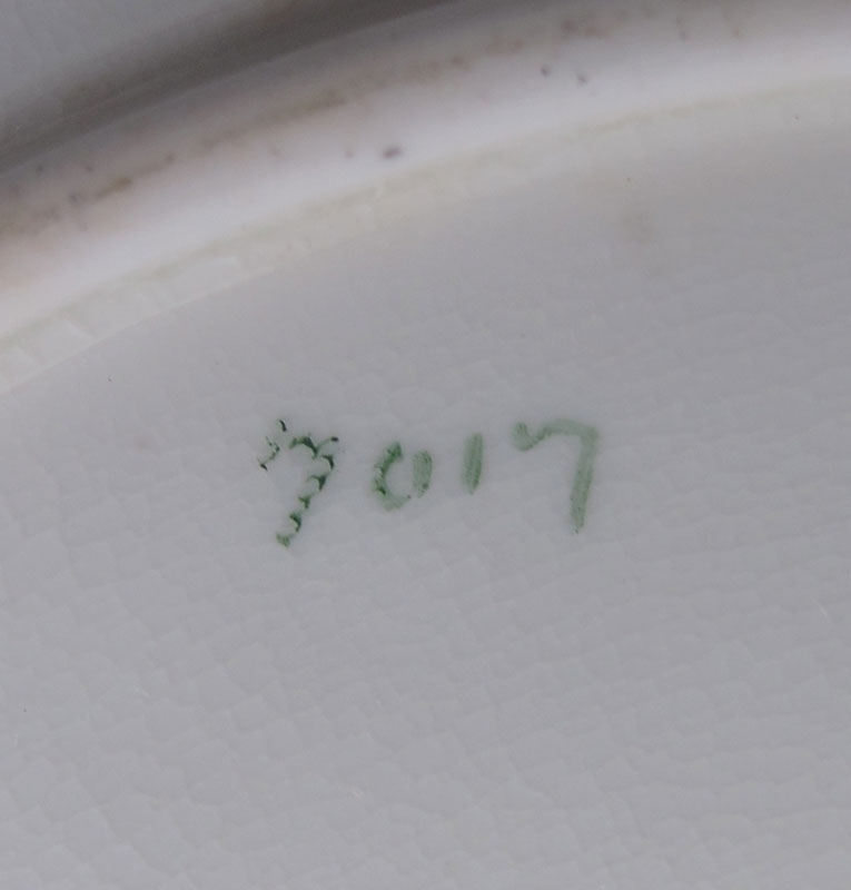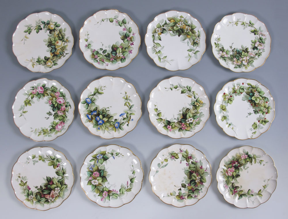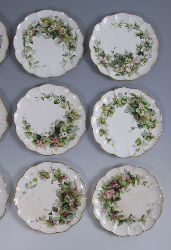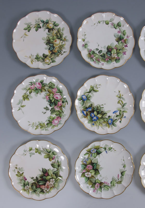 SET OF 12 HAND PAINTED CABINET PLATES: Scallop rim plates with gilt rim. Illegible impressed mark. 9'' dia.