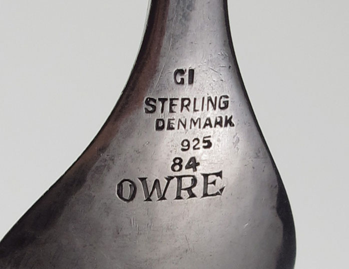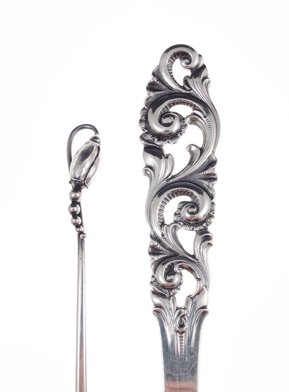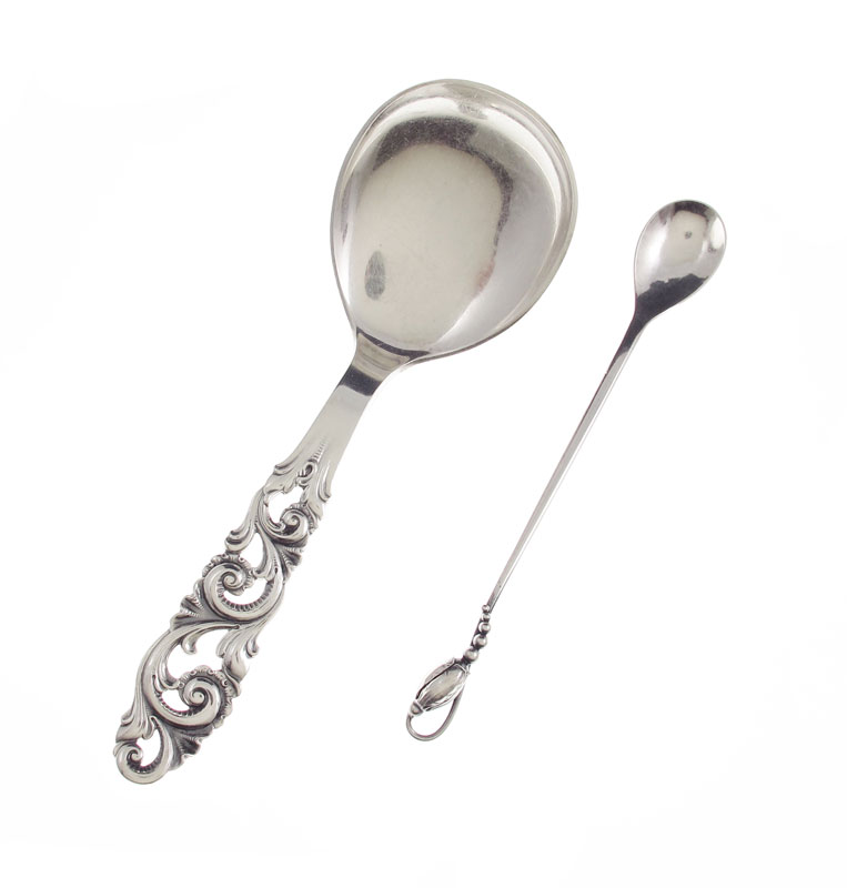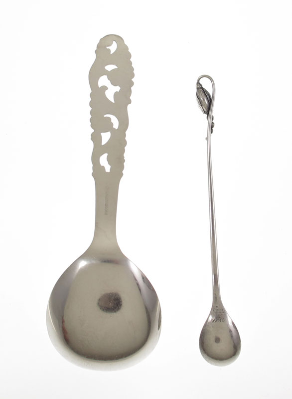 2 PIECE GEORG JENSEN AND NORWEGIAN STERLING FLATWARE: To include 1) Georg Jensen iced tea spoon in the Blossom pattern. 7''. 2) Unknown Norwegian maker 830 silver serving spoon. 8 1/4''. Approx. 3.9 troy oz.